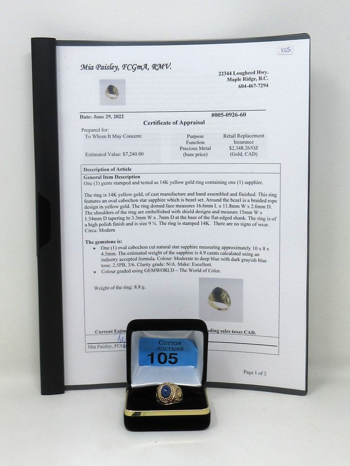 Natural Oval Cabochon Star Sapphire. Size 9 1/4. Gemologist Appraisal for $7,240.