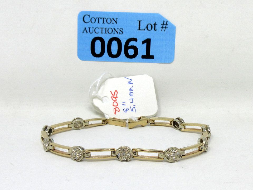 9 Round links set with 5 x .015 carat diamonds graded G/H VS2-S1. Bracelet is 8" long and 5.4 mm wide with safety clasp. Total weight including diamonds: 12.2 grams.