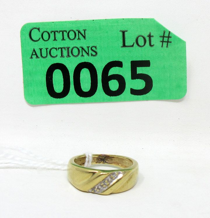 6 mm wide band has 3 faceted diamonds (0.3 CTW) set in a diagonal line. Total weight including diamonds: 2.4 grams.