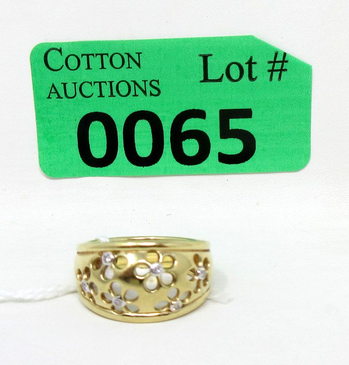 Size 6.5 dome ring has 6 open work flowers with a diamond in the center of each. .05 CTW diamonds. Center of ring is 11.6 mm wide. Total weight including diamonds: 5.1 grams.