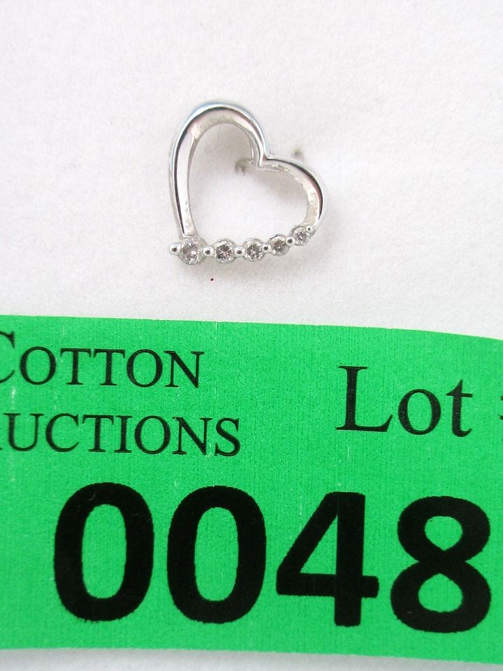 Open fine heart pendant with 5 faceted diamonds. 13 x 11 mm. Total weight including diamonds: 0.8 grams.