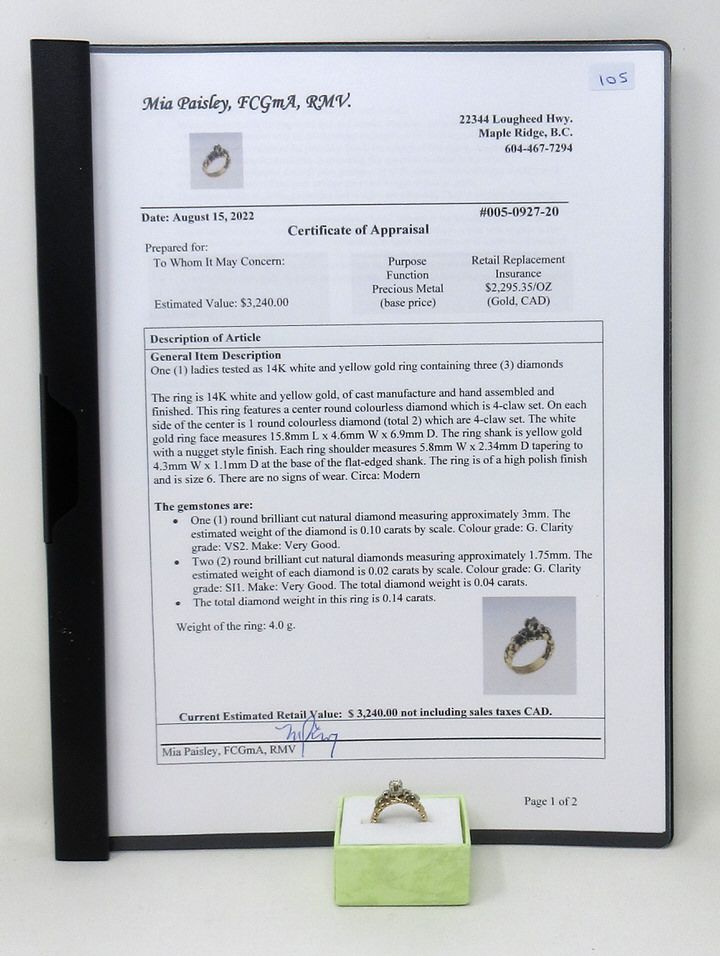 Total 0.14 CTW diamonds. Size 6. Gemologist Appraisal $3,240.