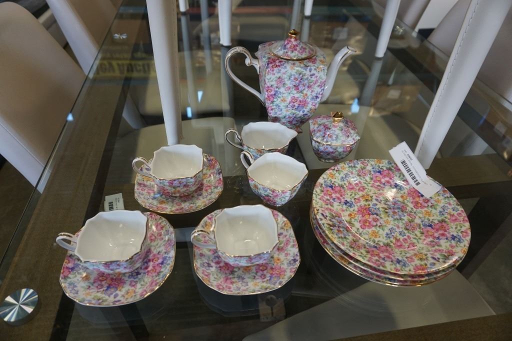 14 PIECES ROYAL COTSWOLDS TEA SET - TEAPOT, CREAM AND SUGAR, 4 CUPS, 3 SAUCERS, 4 PLATES