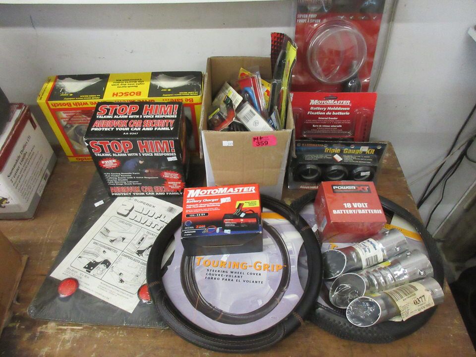 Siphon pump, talking alarm, mud flaps, 18 V battery, box of small accessories and more.
