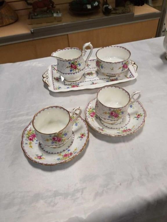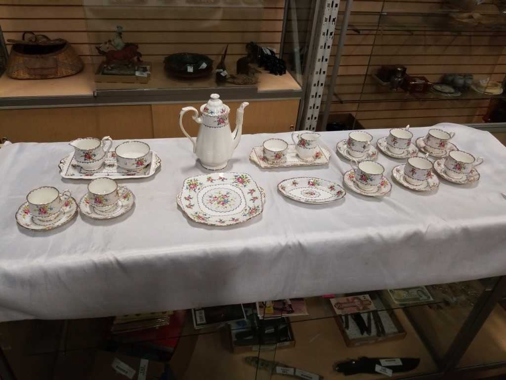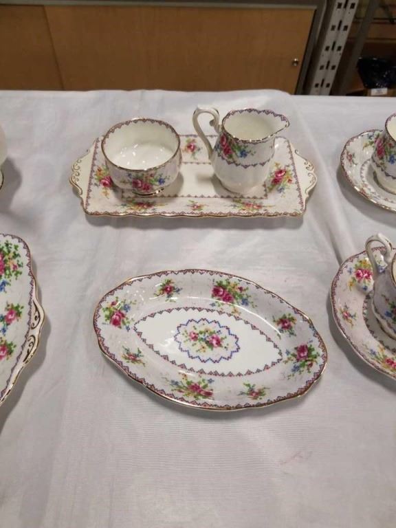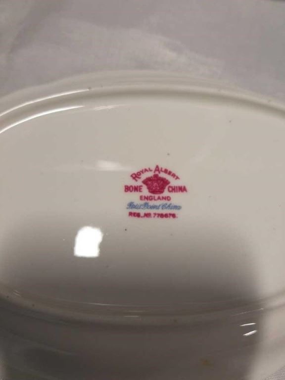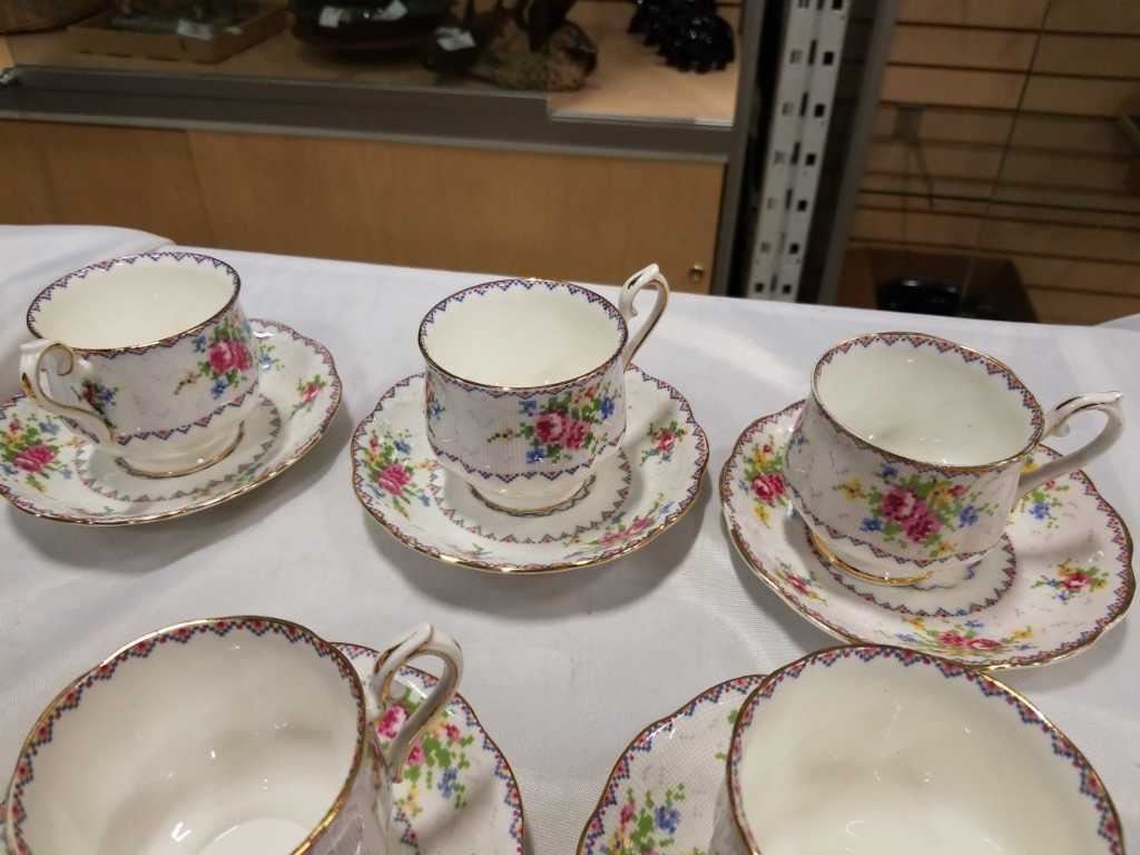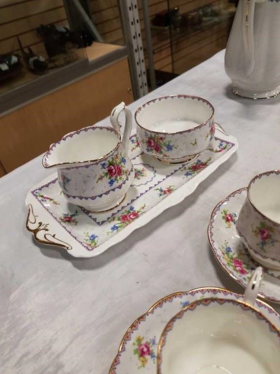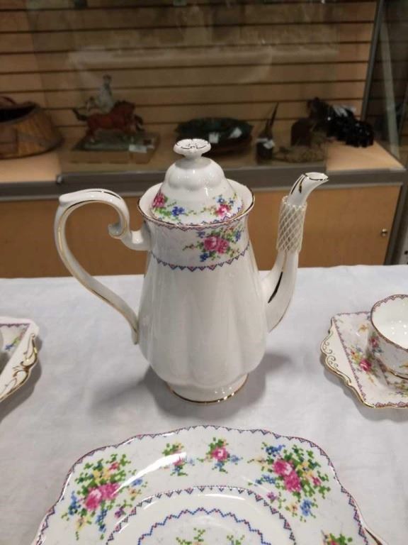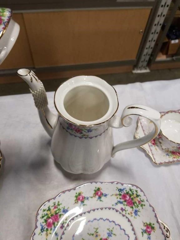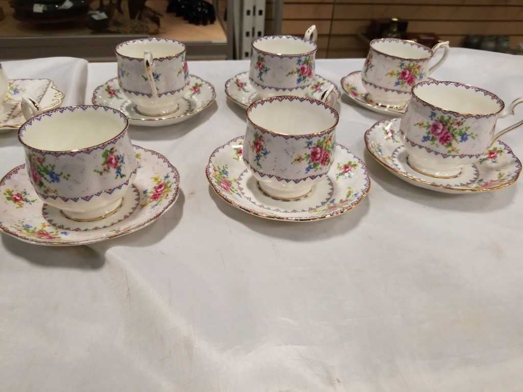 14 ROYAL ALBERT PETITE POINT CHINA, COFFEE POT WITH LID, 8 CUPS AND SAUCERS AND MORE