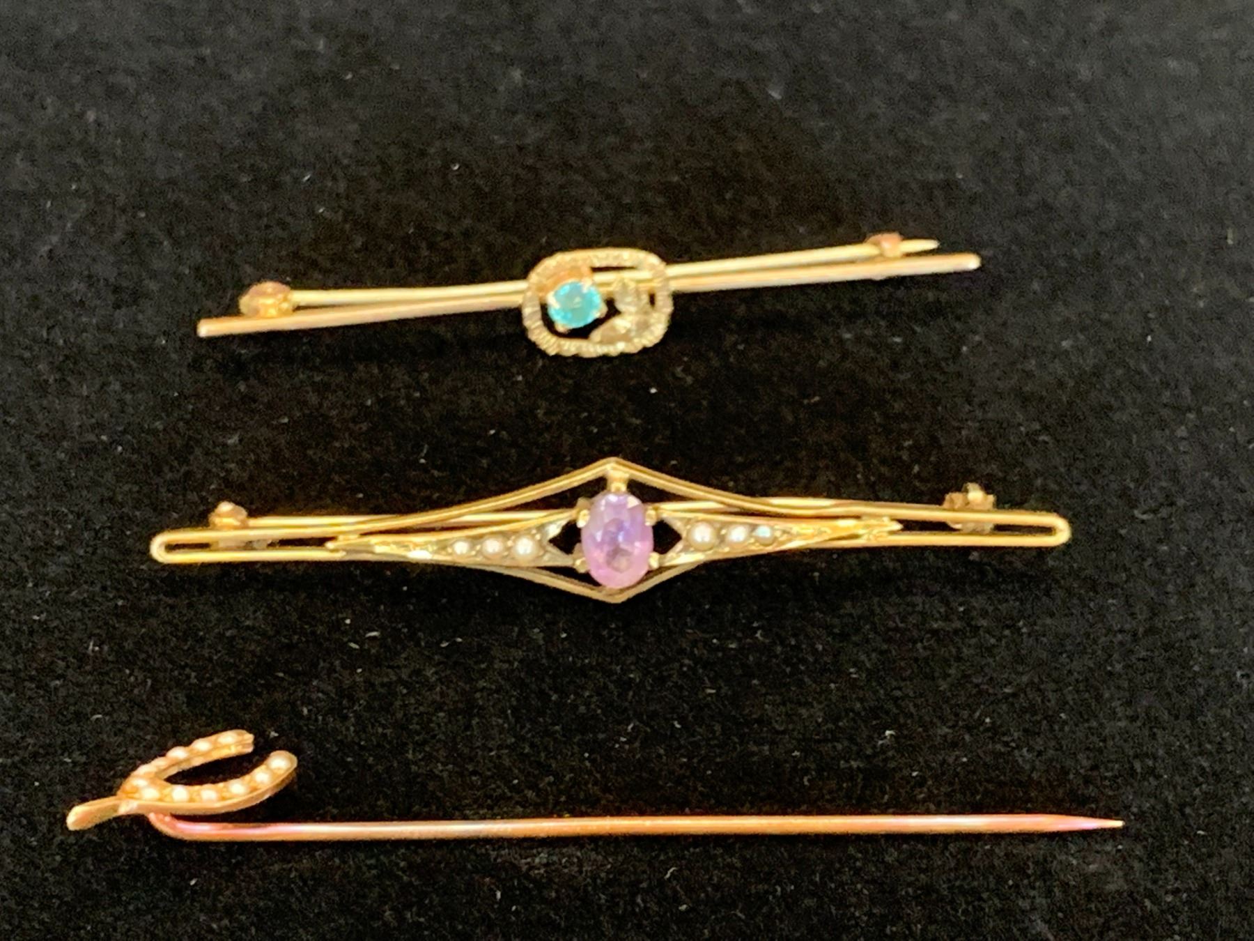 14K BROOCH SET WITH AMETHYST AND PEARS, 10K BROOCH SET WITH BLUE STONE, 14K STICK PIN SET WITH PEARLS