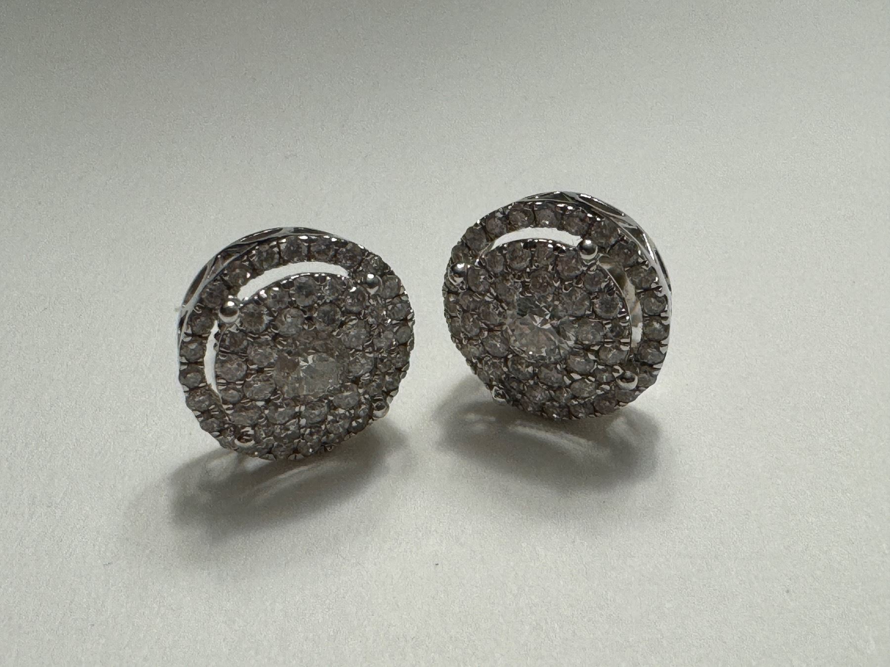 14KT PAIR OF WHITE GOLD DIAMOND SET EARRINGS WITH 24 DIAMONDS TWO ROUND BRILLIANT CUT DIAMONDS TOTAL WEIGHT .60 CARAT 104 ROUND BRILLIANT CUT DIAMONDS TOTAL WEIGHT 1.40 CARAT REPLACEMENT VALUE $5,400.00 APPRAISAL INCLUDED