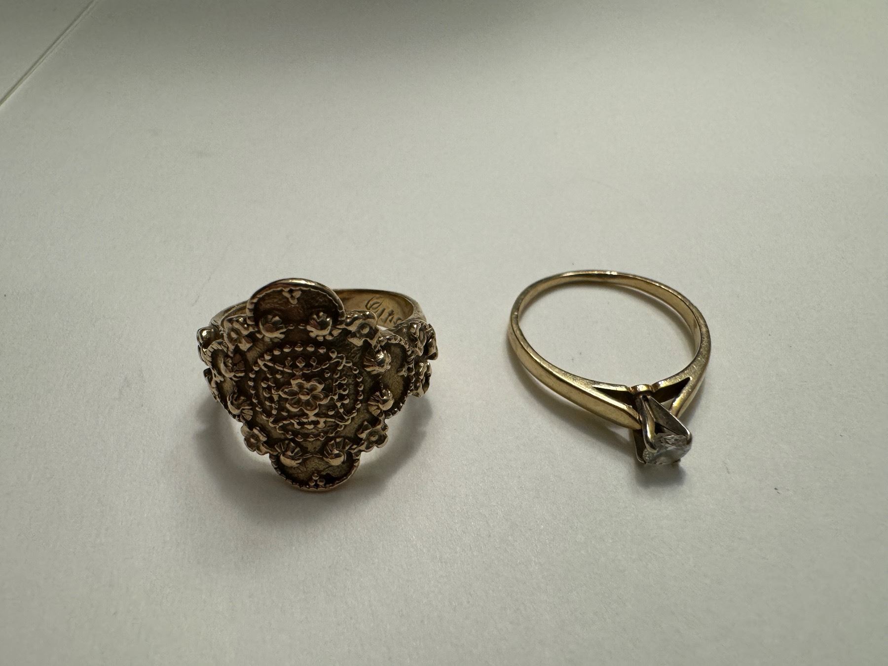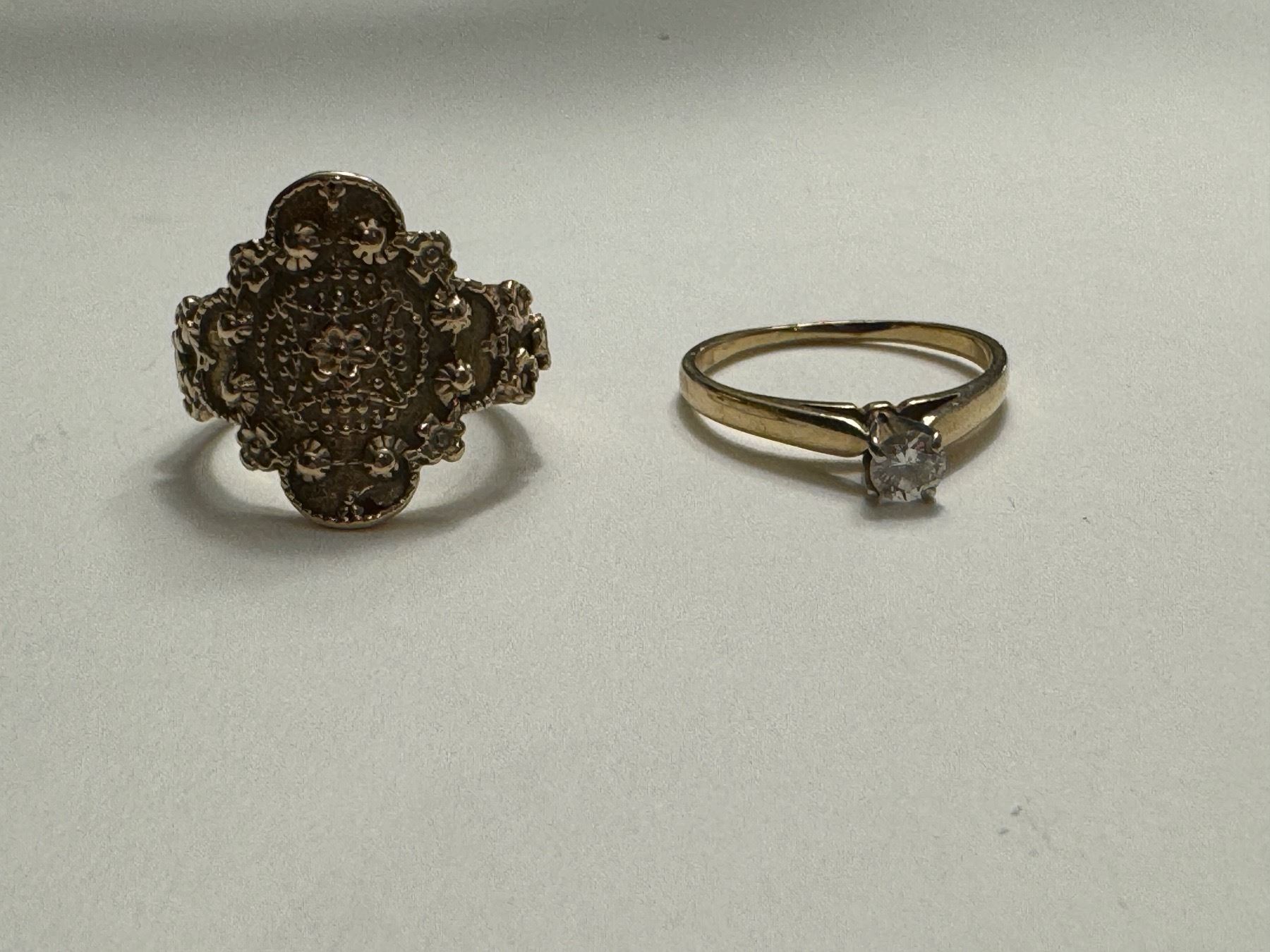 14KT YELLOW AND WHITE GOLD DIAMOND LADIES SET DRESS OR ENGAGEMENT RING WITH 1 ROUND BRILLIANT CUT DIAMOND APPROX .20CARAT, 10KT YELLOW GOLD ANTIQUE STYLE LADIES DRESS RING TOTAL REPLACEMENT $1,850.00 APPRAISAL INCLUDED