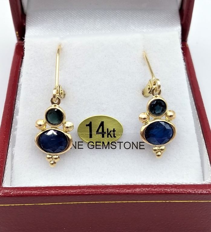 14KT YELLOW GOLD GENUINE BLUE SAPPHIRE DROP EARRINGS W/ APPRAISAL $1500 - 4 SAPPHIRE (2CTS)