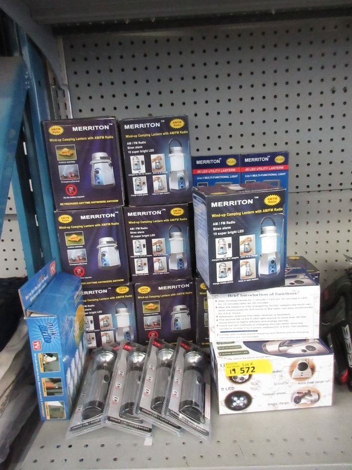 9 Wind-up camping lanterns with AM/FM radio, two 45 LED utility lanterns, 3 Dynamo LED torches with AM/FM radio, four 3-in-1 LED flashlights & a package of 10 LED lights.