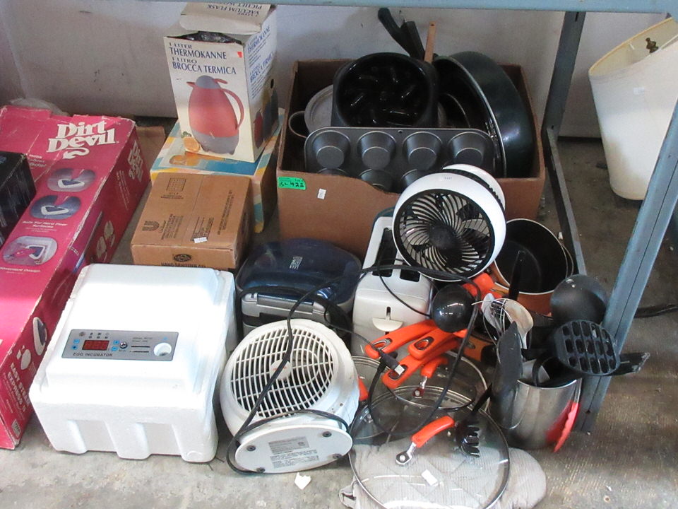 Heaters, utensils, egg incubator, toaster, pots and pans, bakeware and more.
