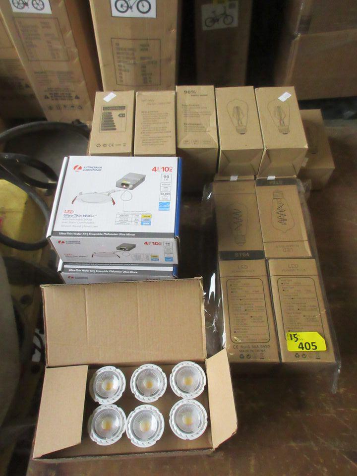 Two 4" Ultra thin wafer lights, box of 8 GU10 bulbs, pack of 4 ST64 & 58 bulbs, and 11 E26 bulbs.