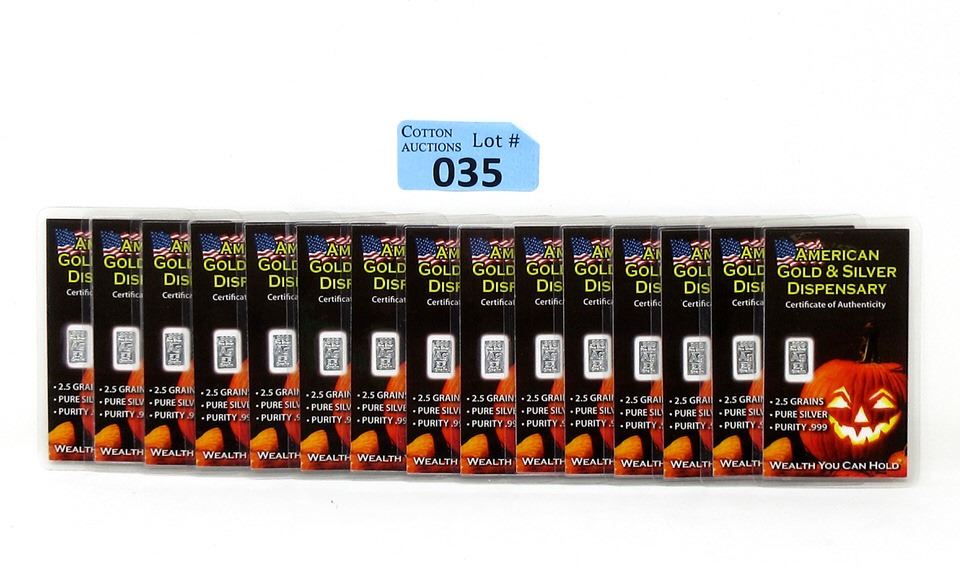 Each bar is 2.5 Grains. Total of 37.5 Grains. Minted in the USA. All individually sealed on certificate of authenticity cards. Tax exempt
