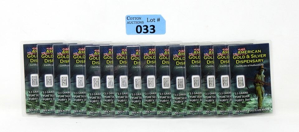 Each bar is 2.5 Grains. Total of 37.5 Grains. Minted in the USA. All individually sealed on certificate of authenticity cards. Tax exempt