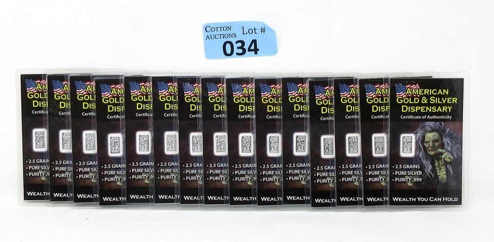 Each bar is 2.5 Grains. Total of 37.5 Grains. Minted in the USA. All individually sealed on certificate of authenticity cards. Tax exempt