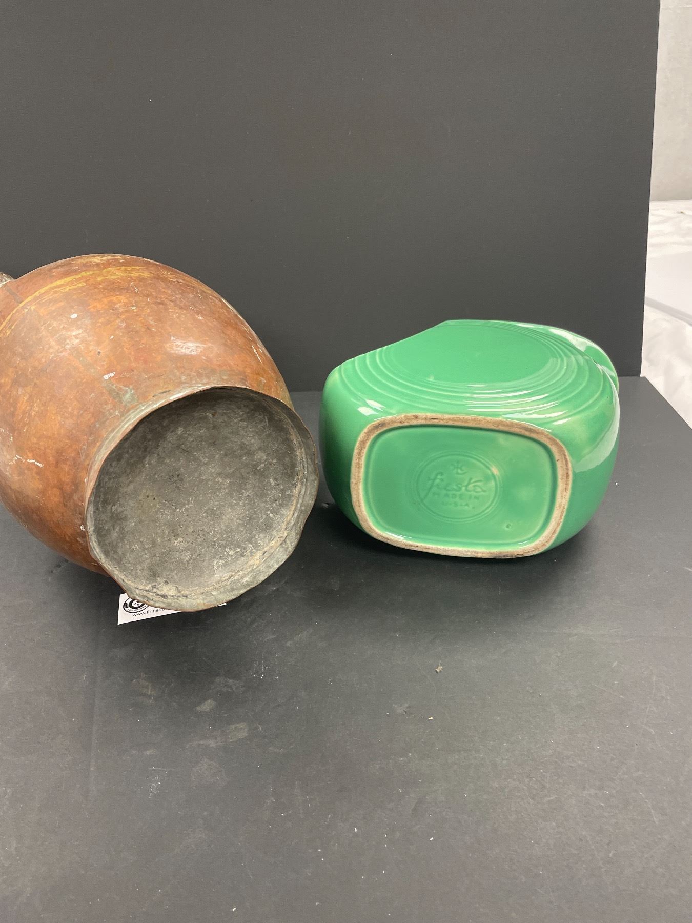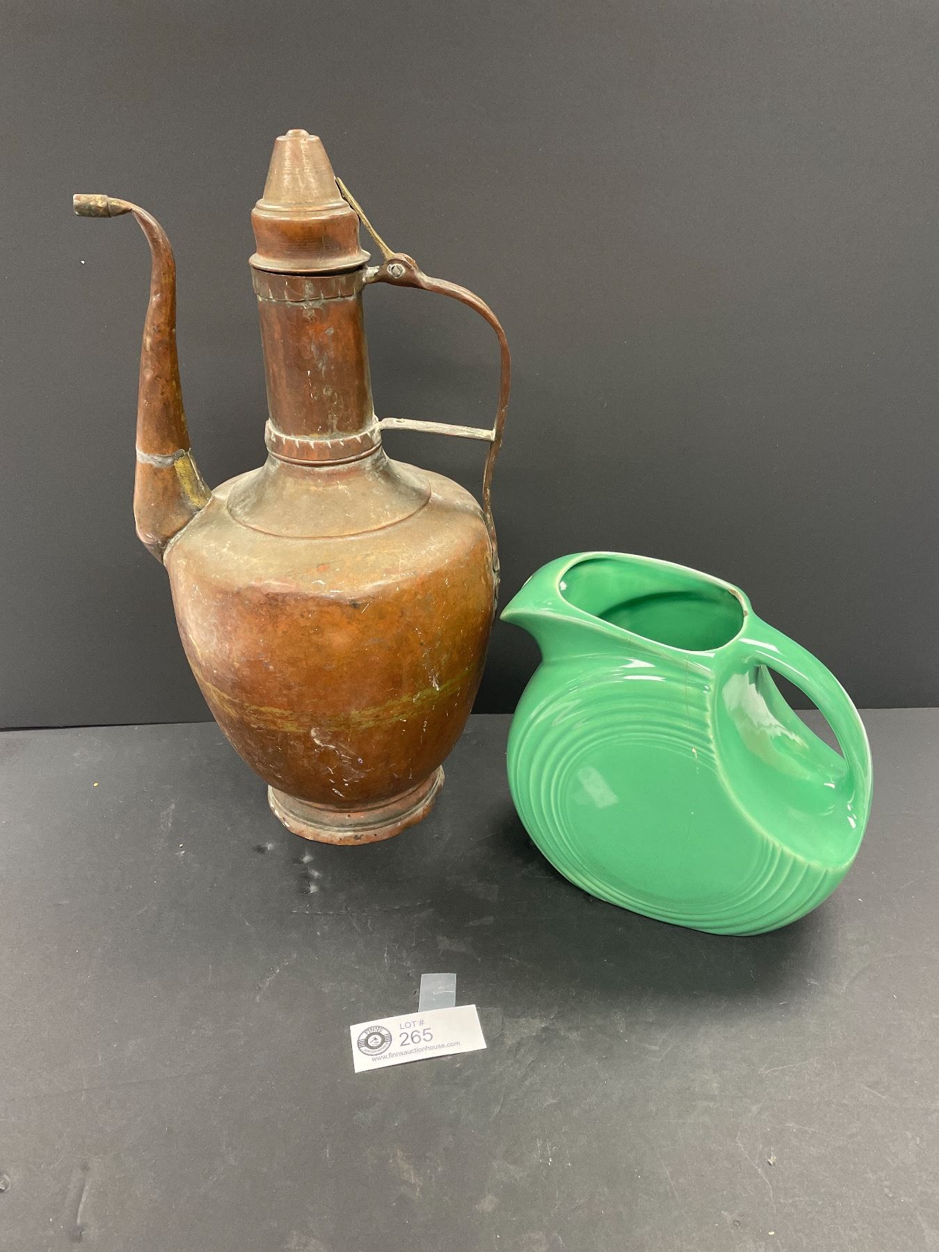 16" Tall Vintage Copper Jug Plus Fiesta Pottery Jug As Found