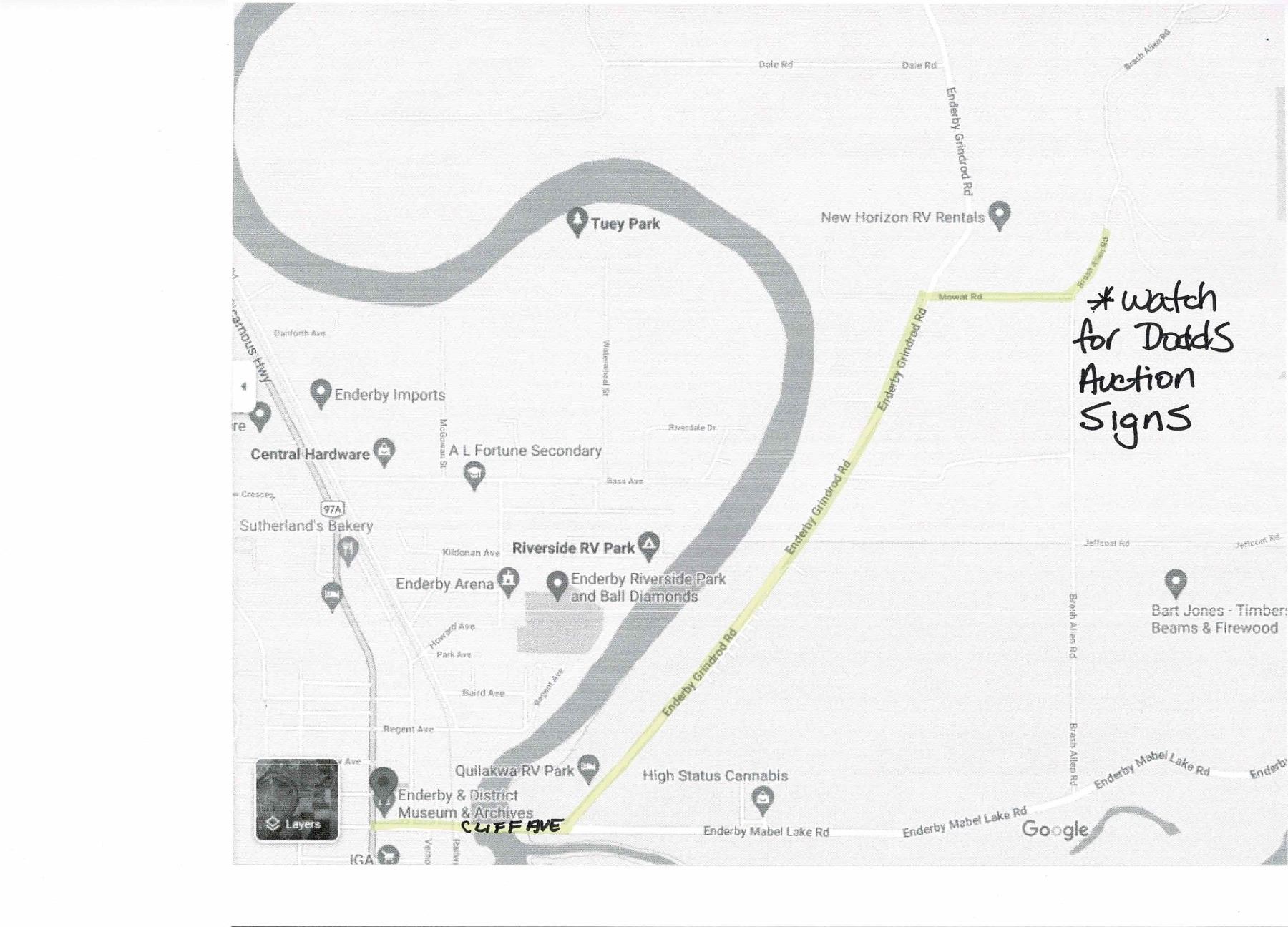 From Vernon take Hwy97A to Enderby, turn right onto Cliff Ave., then left onto Enderby Grindrod Rd., then right onto Mowat Rd., then left onto Brash Allen Rd.