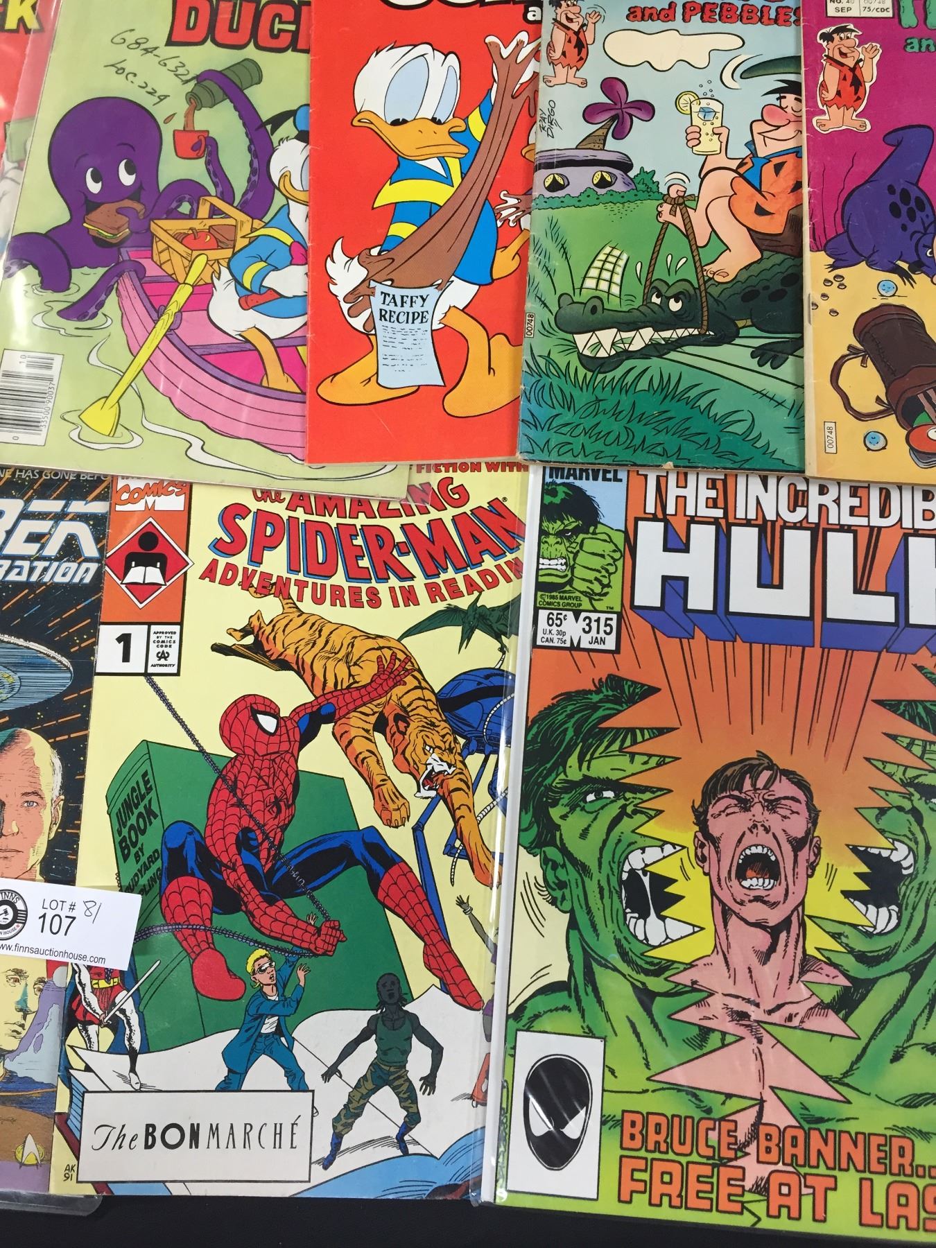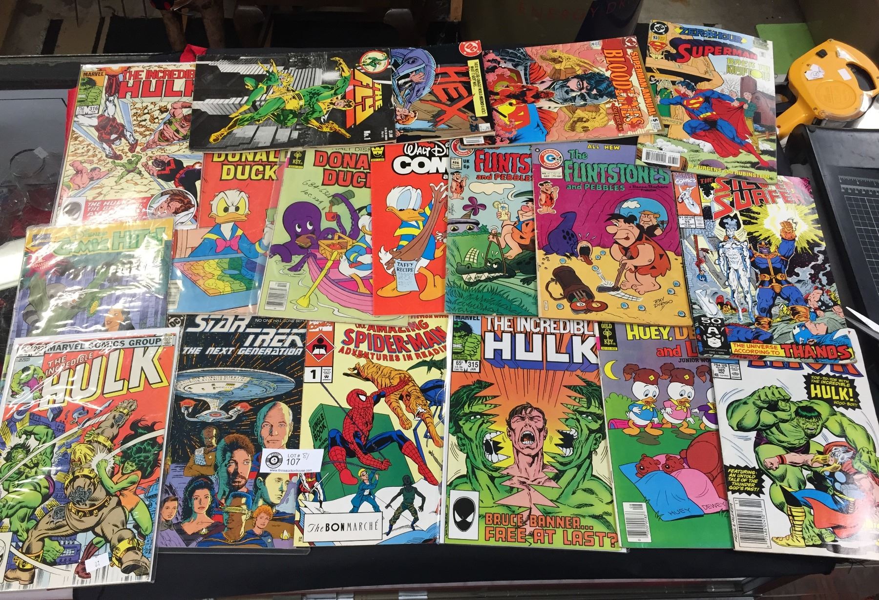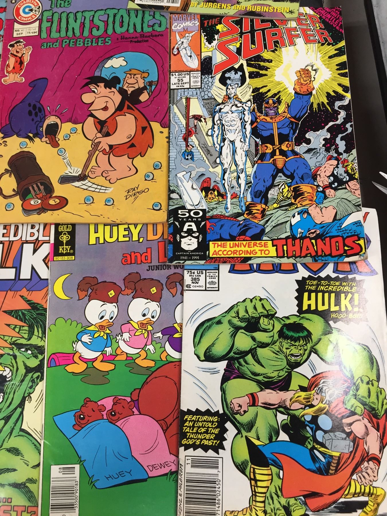 18 Comics. The Incredible Hulk, Flintstones,Superman, Spiderman Etc. On White Boards in Comic Bags