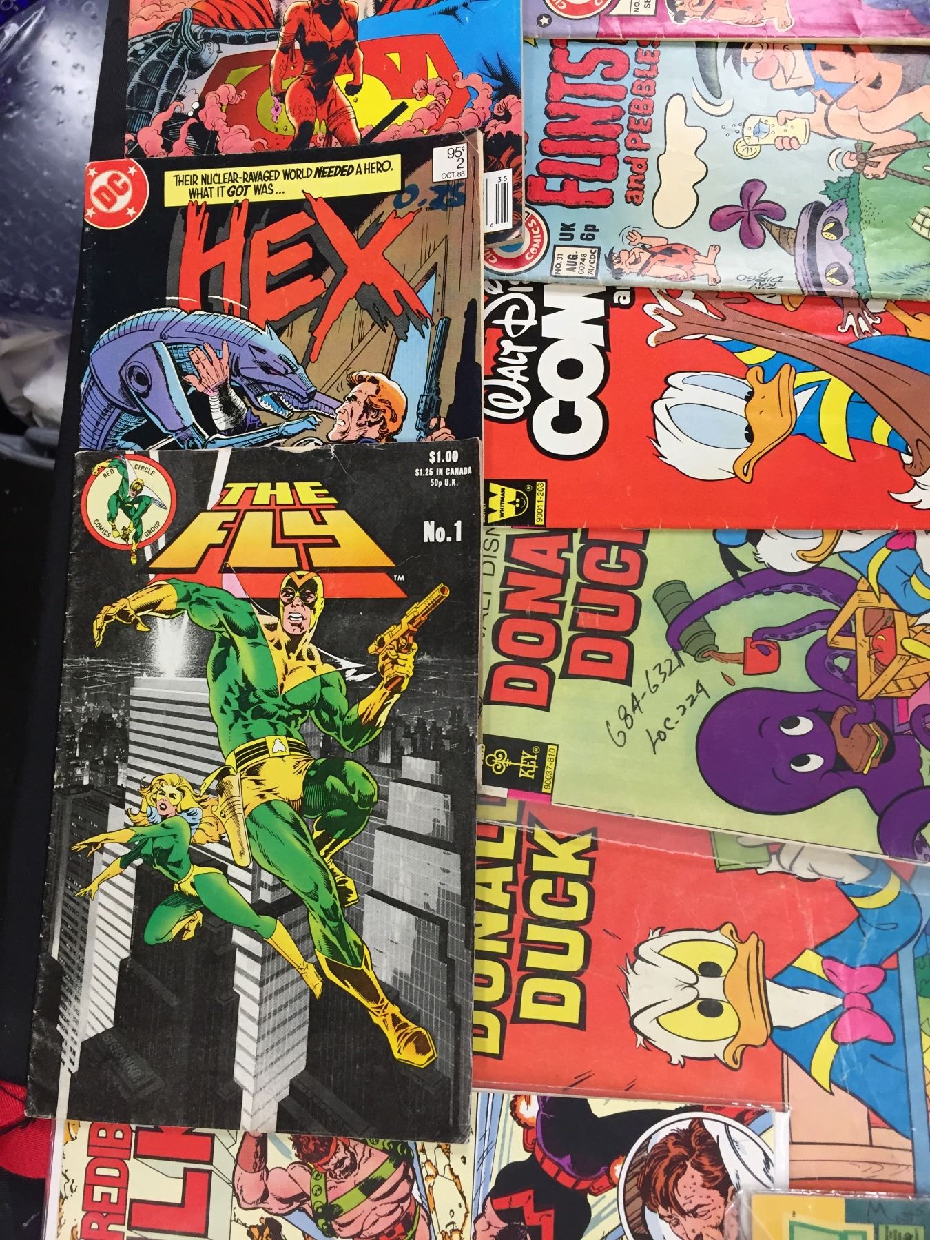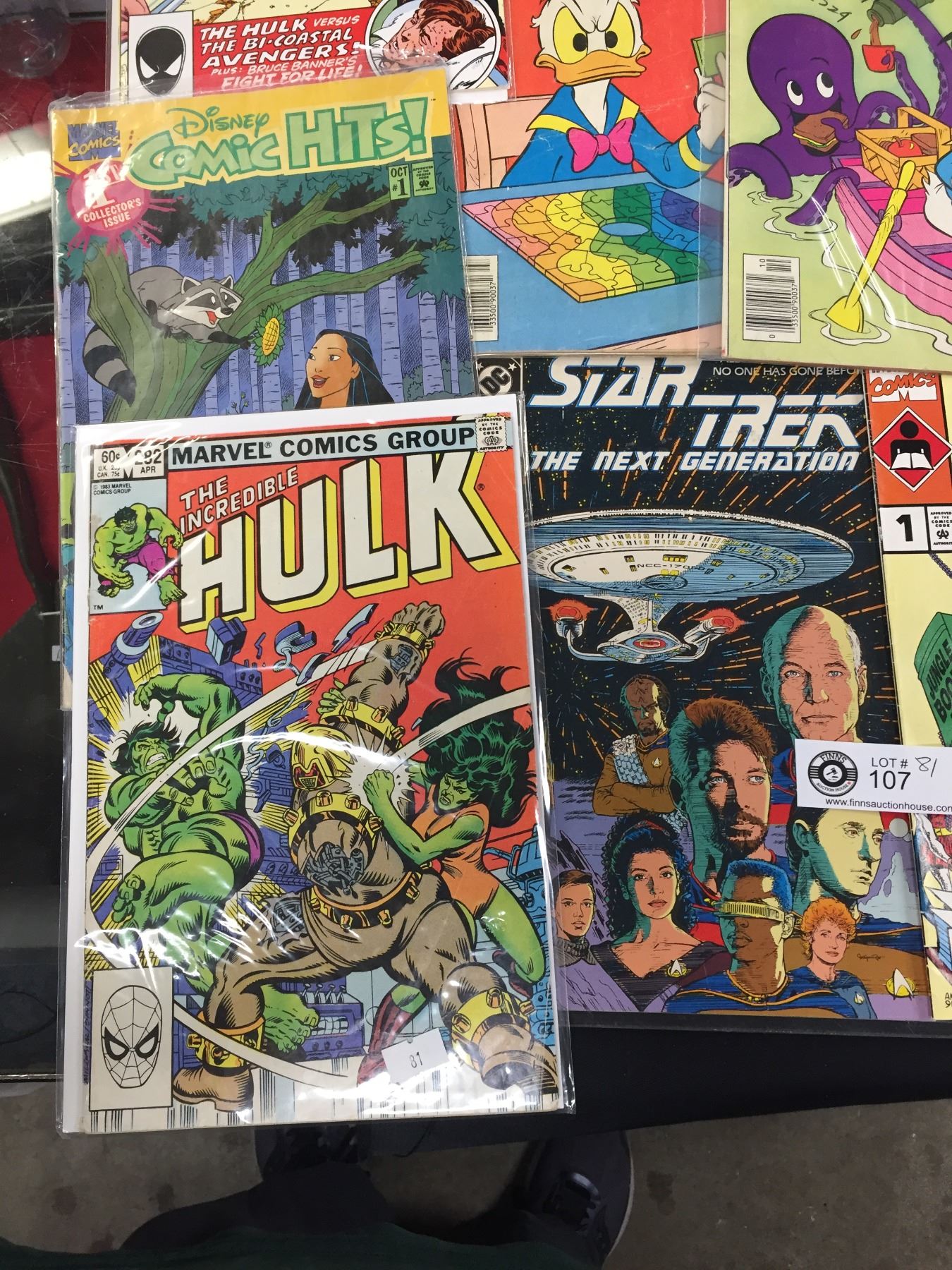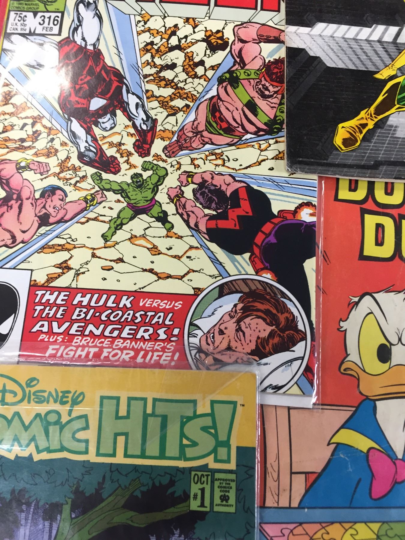18 Comics. The Incredible Hulk, Flintstones,Superman, Spiderman Etc. On White Boards in Comic Bags