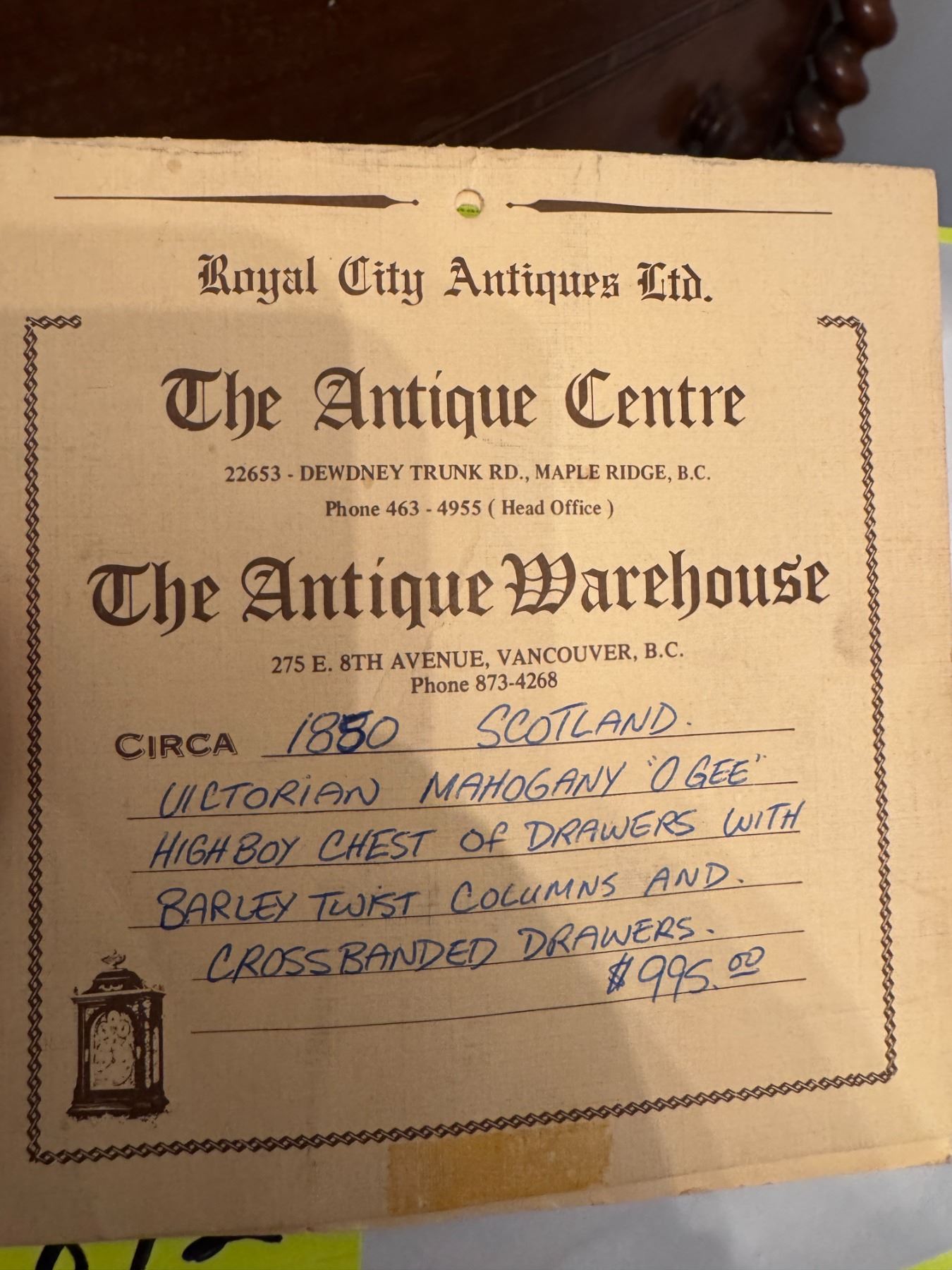 1850 Scotland Victorian mahogany "OGEE" hi boy, chest of drawers with barley twist, columns, and cro