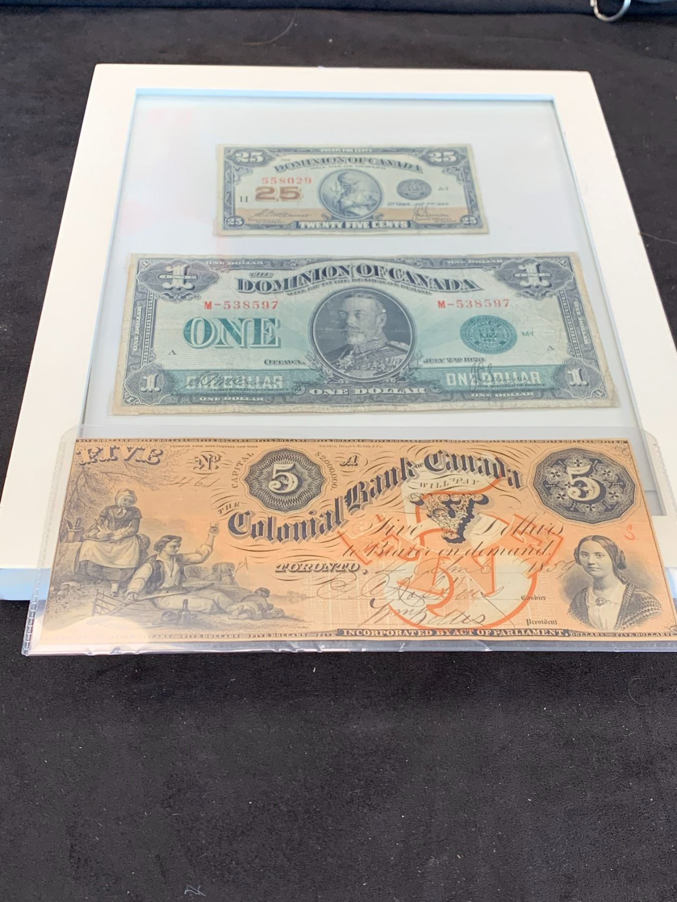 1859 COLONIAL BANK OF CANADA $5 BILL AND 1923 DOMINION OF CANADA $1 BILL AND 25C BILL