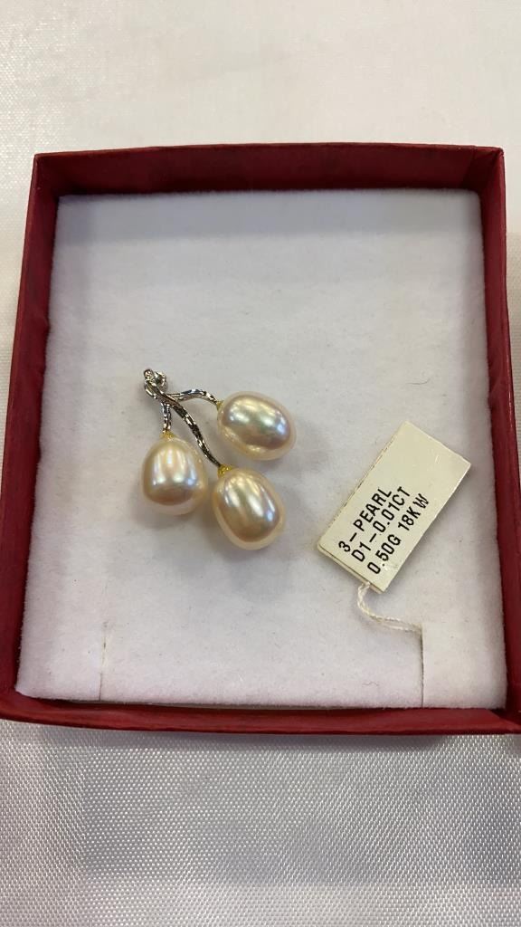 18KT WHITE GOLD 3 PEARL PENDANT AND 10KT GOLD EARRINGS
