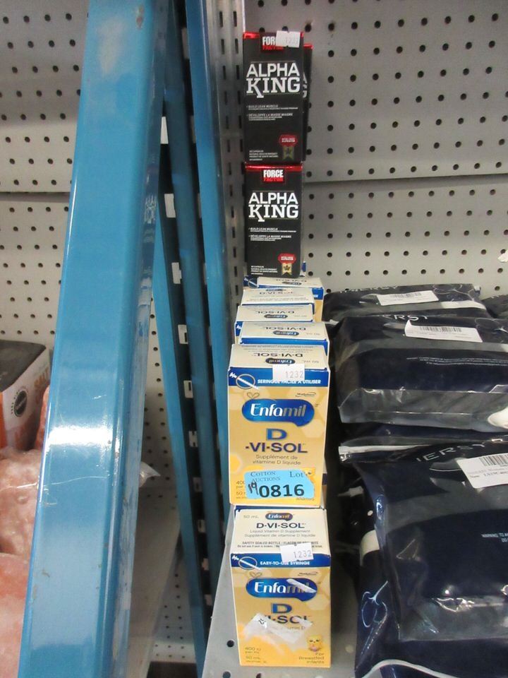 4 Bottles of Alpha King muscle building supplement (Exp. Jan 2021) and 15 bottles of Enfamil D VI-SOL supplements for breastfed infant (BB Aug 2021)