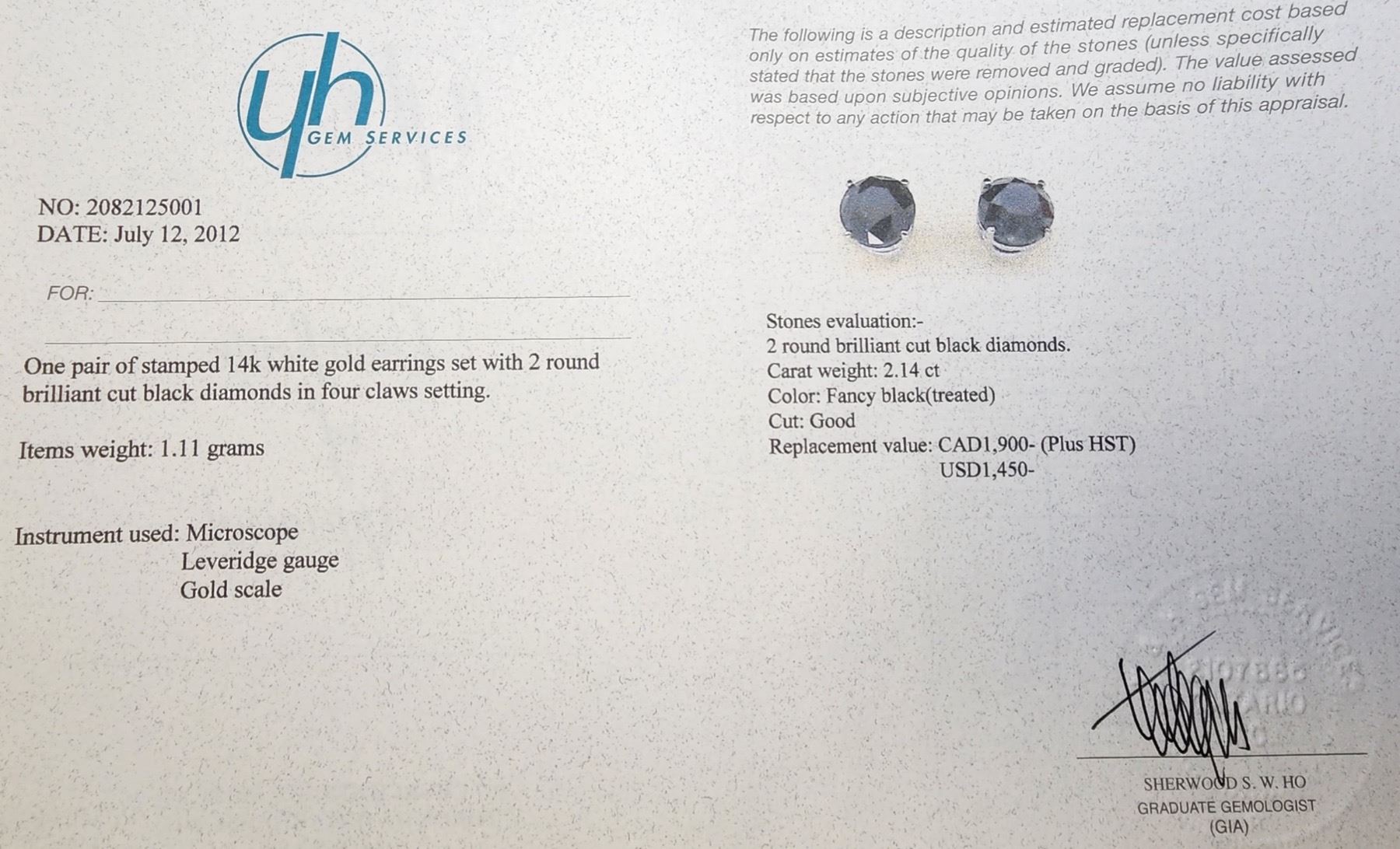 14K White Gold Black Diamond(2.14ct) Earrings (~weight 1.11g), Made in Canada, Appraised Retail $1900