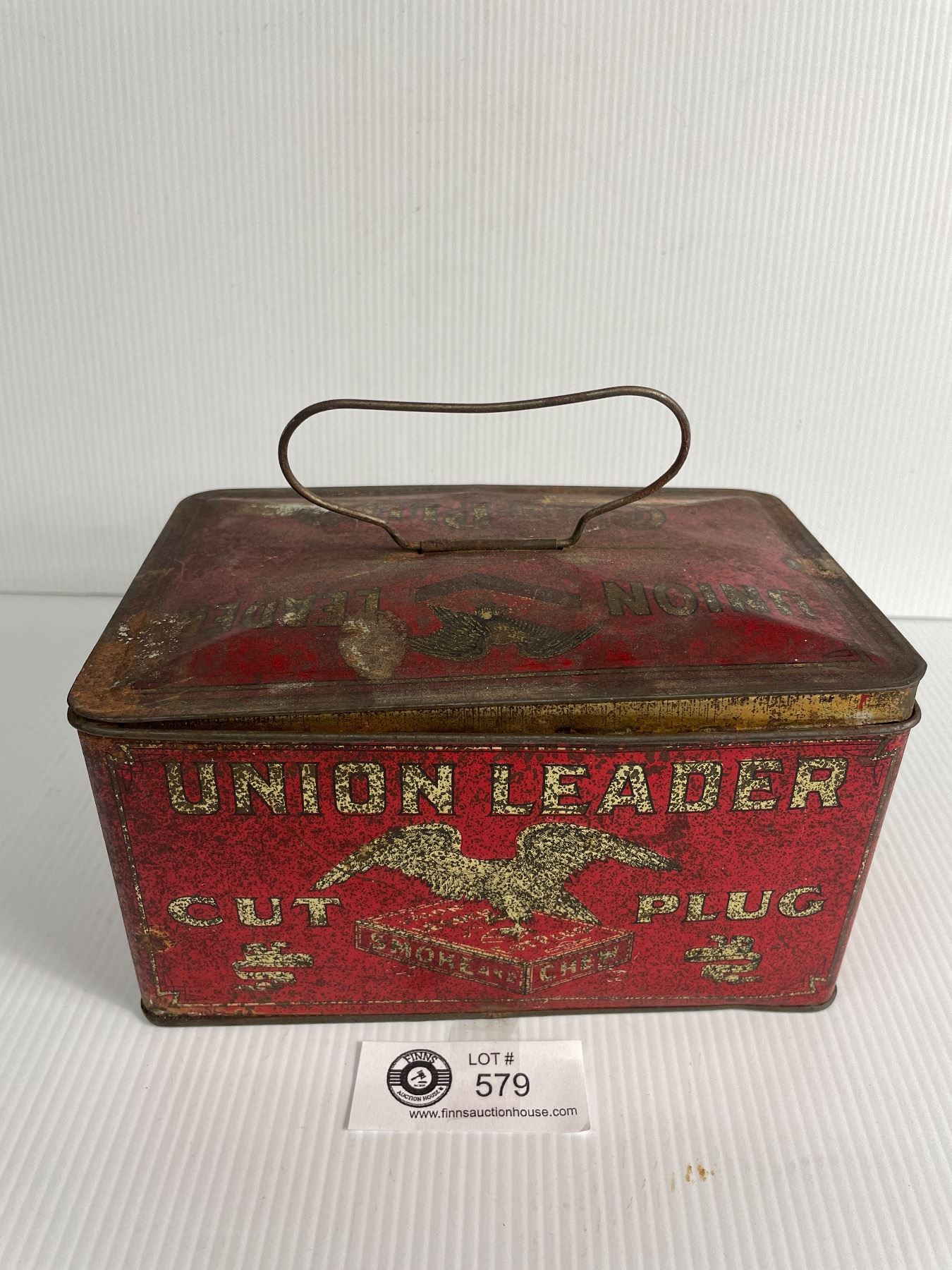 1920's Union Leader Tobacco "Lunch Box" Tin, Bale Handle, Hinged Lid, Great Graphics