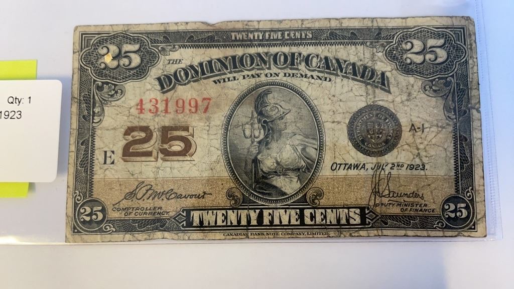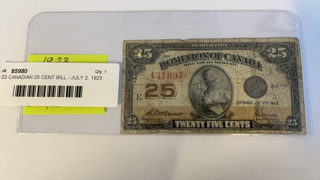 1923 CANADIAN 25 CENT BILL - JULY 2, 1923