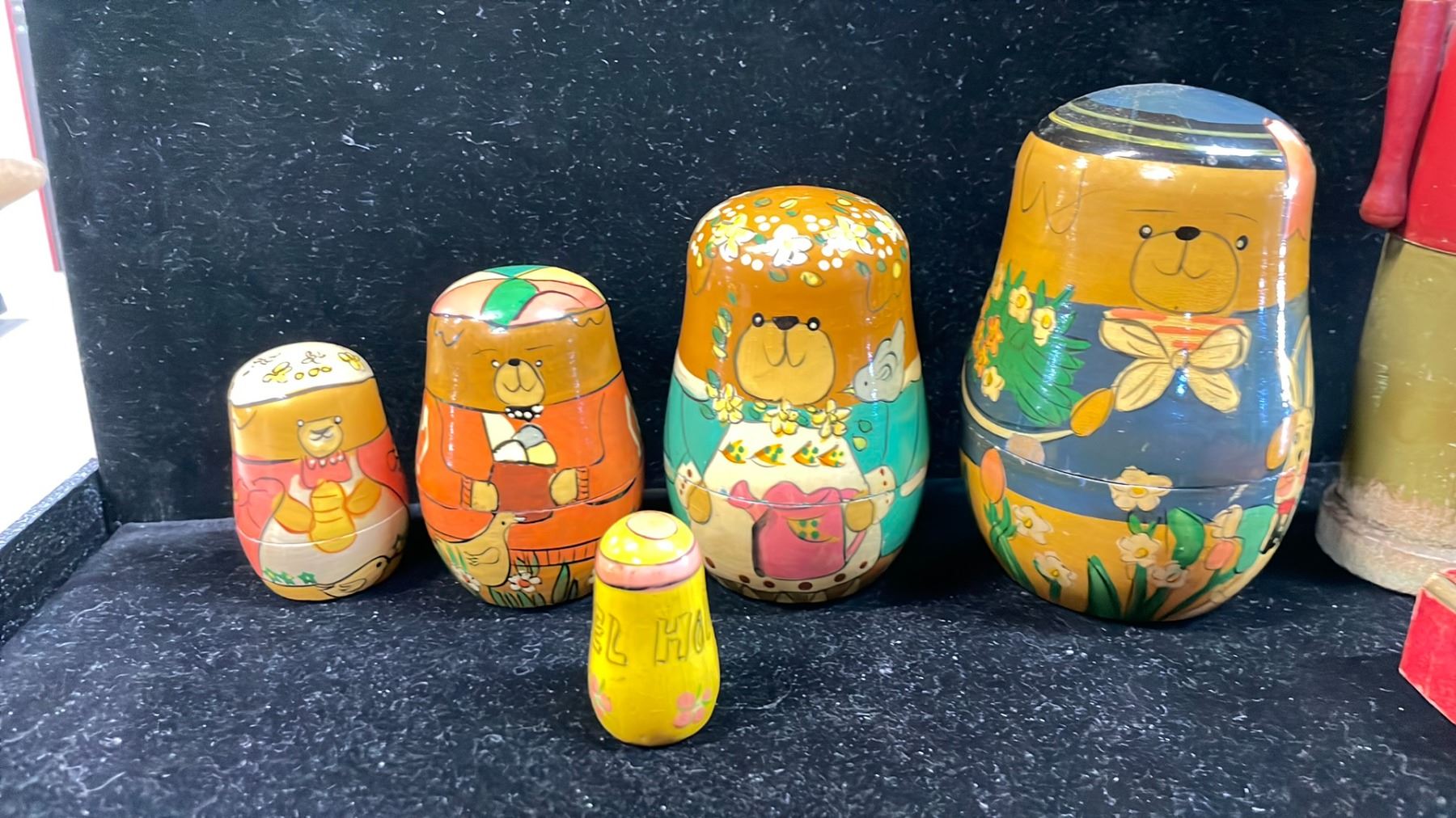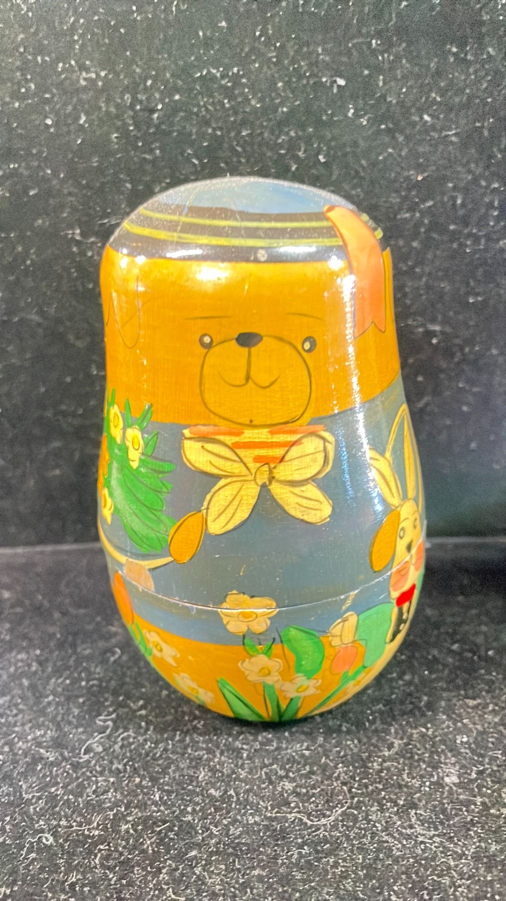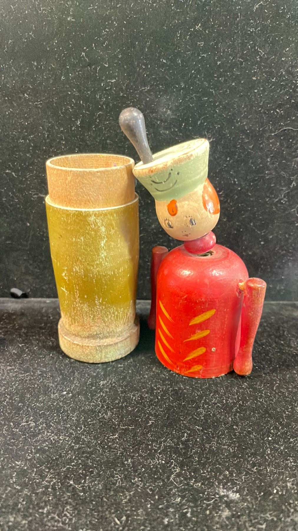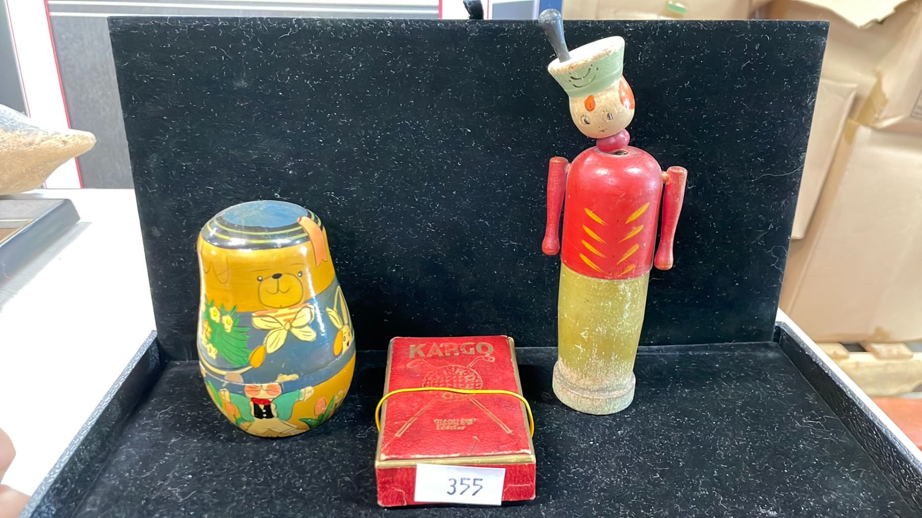 1930'S KIDS WOODEN PENCIL HOLDER, 1931 GOLF CARD GAME & 1950'S 5-PC NESTING BEARS