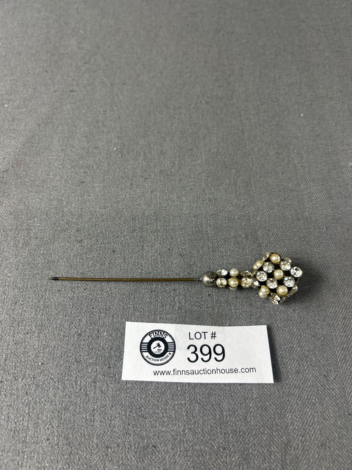 1930's Rhinestone & Faux Pearl Hat Pin. Some stones missing.