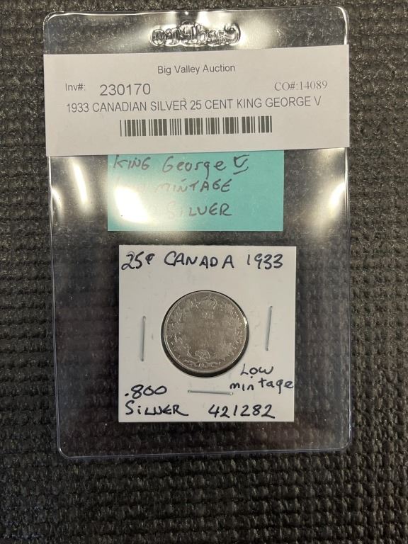 1933 CANADIAN SILVER 25 CENT KING GEORGE V .800 SILVER