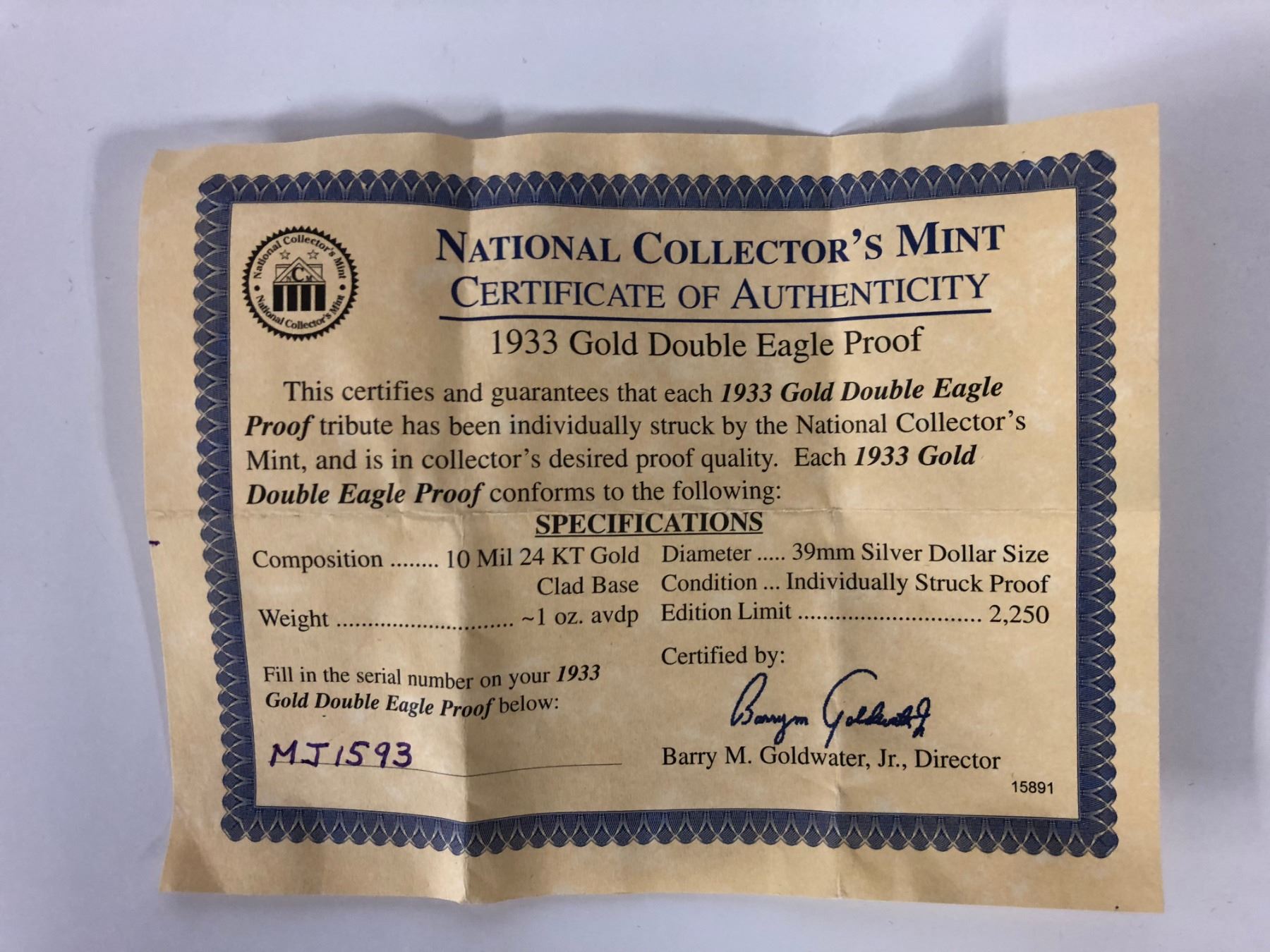 1933 GOLD DOUBLE EAGLE PROOF (NATIONAL COLLECTOR'S MINT COA)