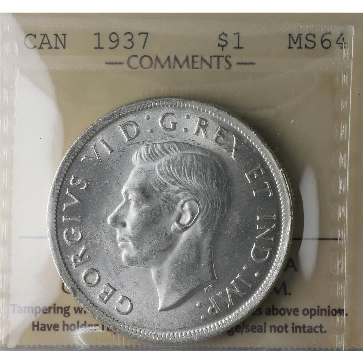 1937 King George VI Canadian Silver Dollar Choice ICCS-MS-64