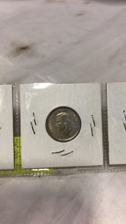 1939 CANADIAN COINS .800 SILVER 25 CENT, 10 CENT, AND NICKEL AND 1 CENT