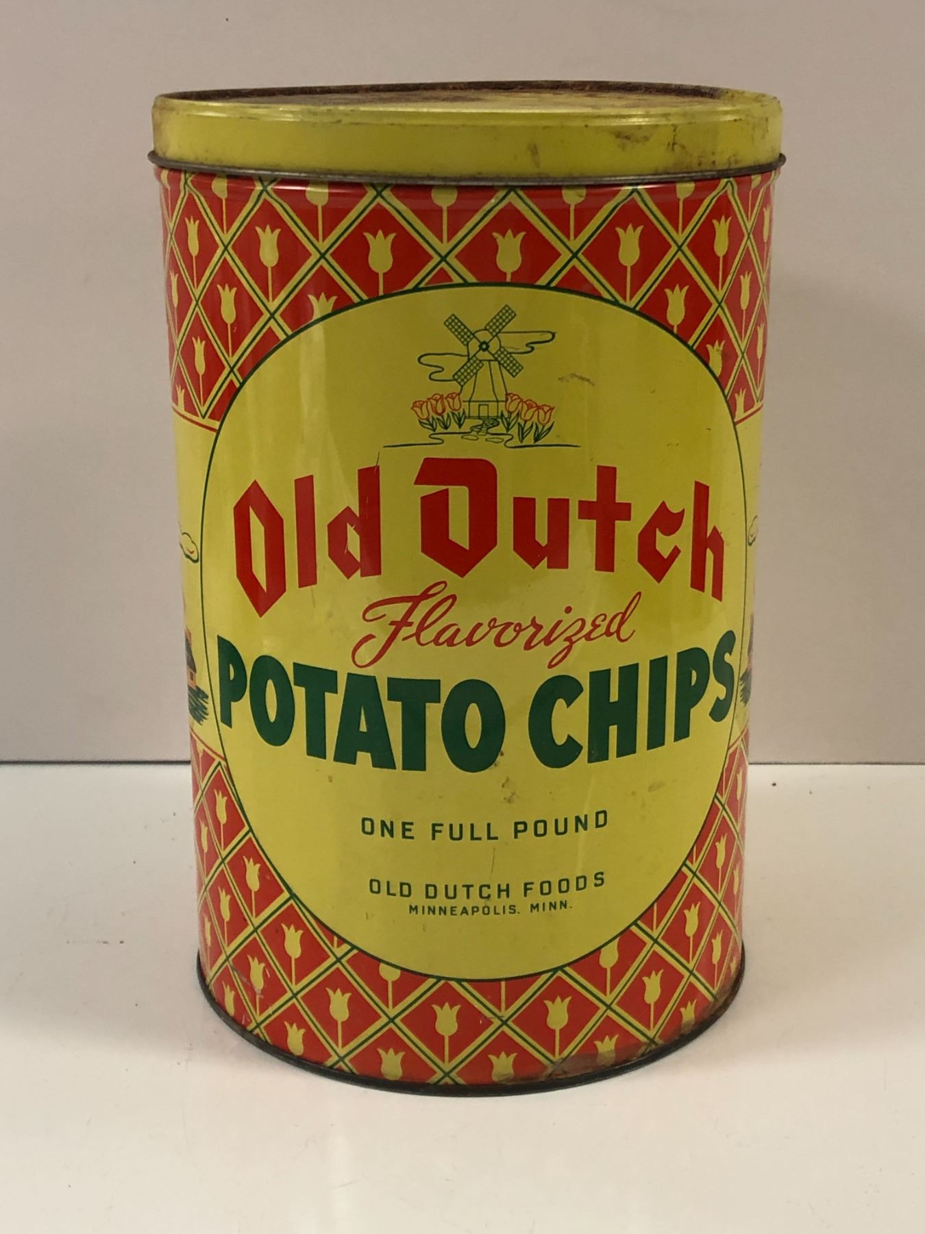 1940s/1950s Old Dutch Flavourized Potato Chips collectors tin - 11 1/2in tall x 7 1/2in diameter
