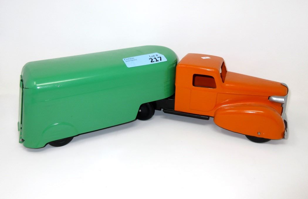 Pressed Steel. With Wood Wheels & Back Opening Hatch. 21" x 5"