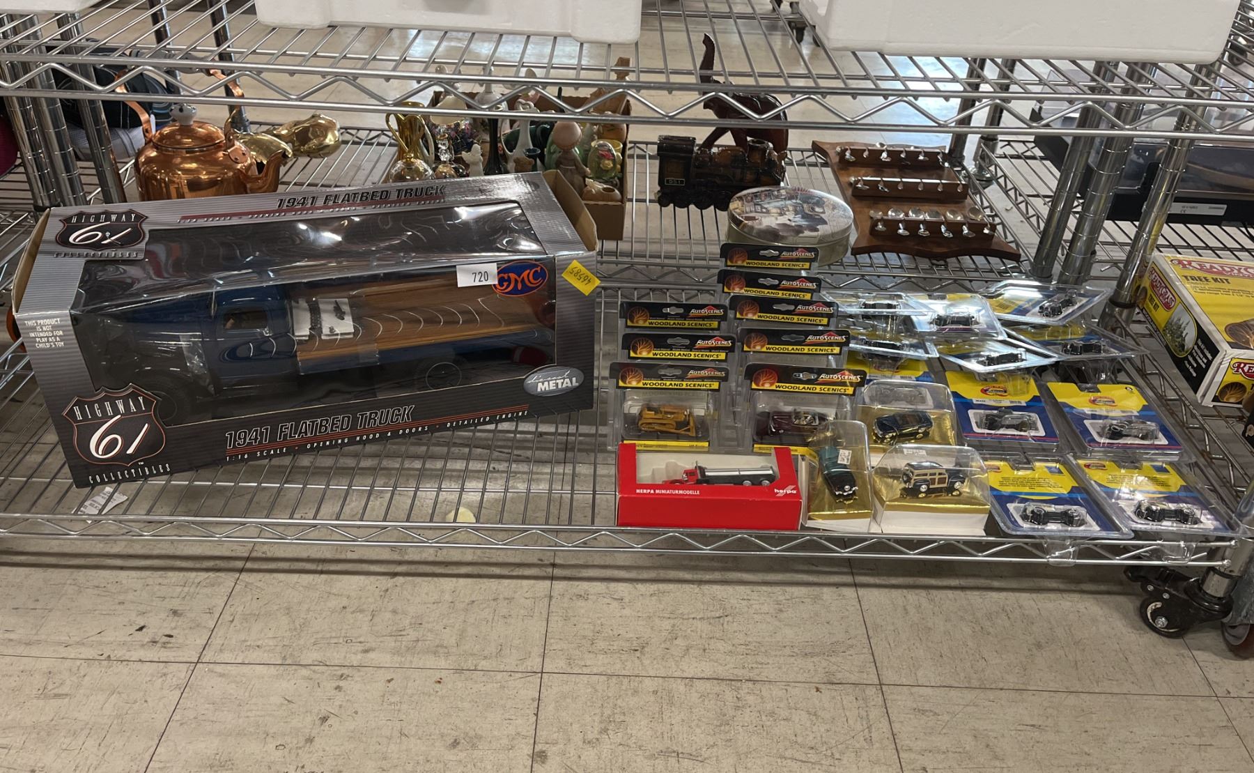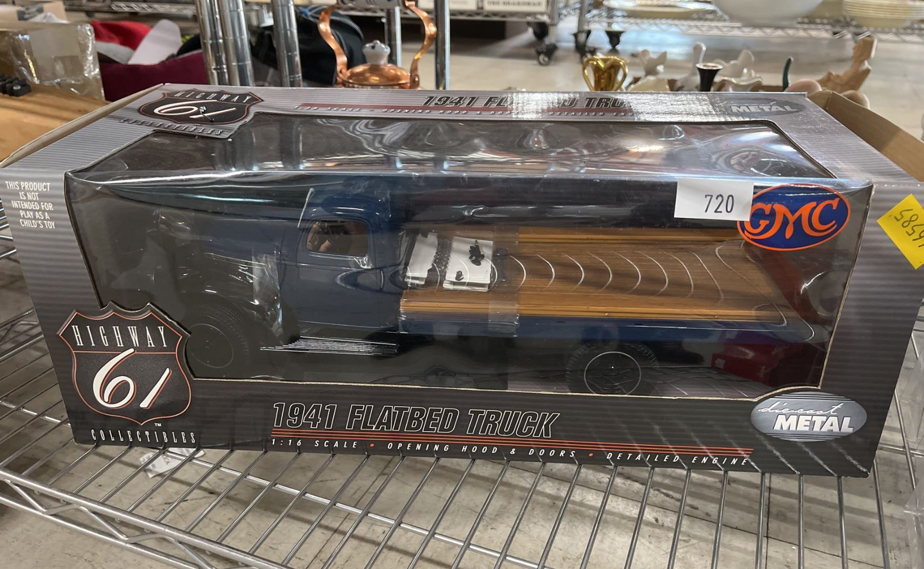1941 FLATBED DIE CAST TRUCK & ASSORTED HO SCALE MODEL TRAIN VEHICLES