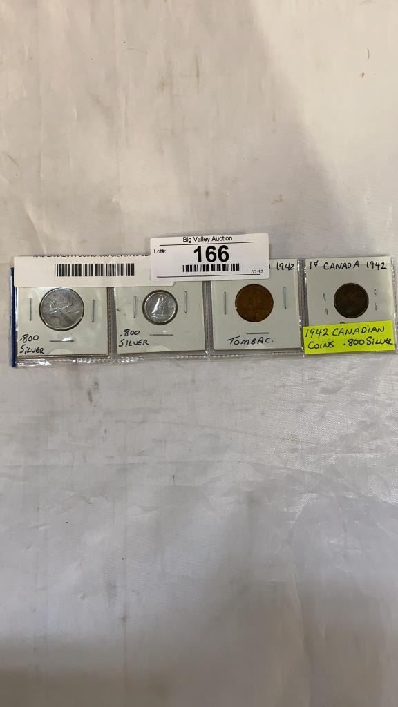 1942 CANADIAN COINS .800 SILVER 25 CENT, 10 CENT, AND 1942 TOMBAC NICKEL