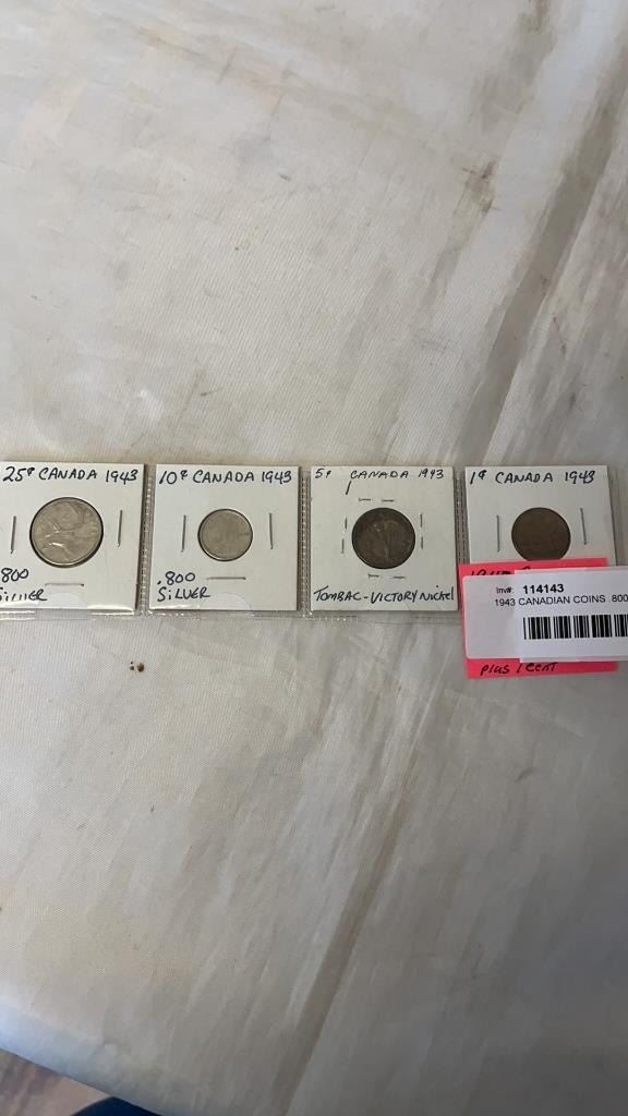 1943 CANADIAN COINS .800 SILVER 25 CENT, 10 CENT PLUS TOMBAC VICTORY 5 CENT PLUS 1 CENT