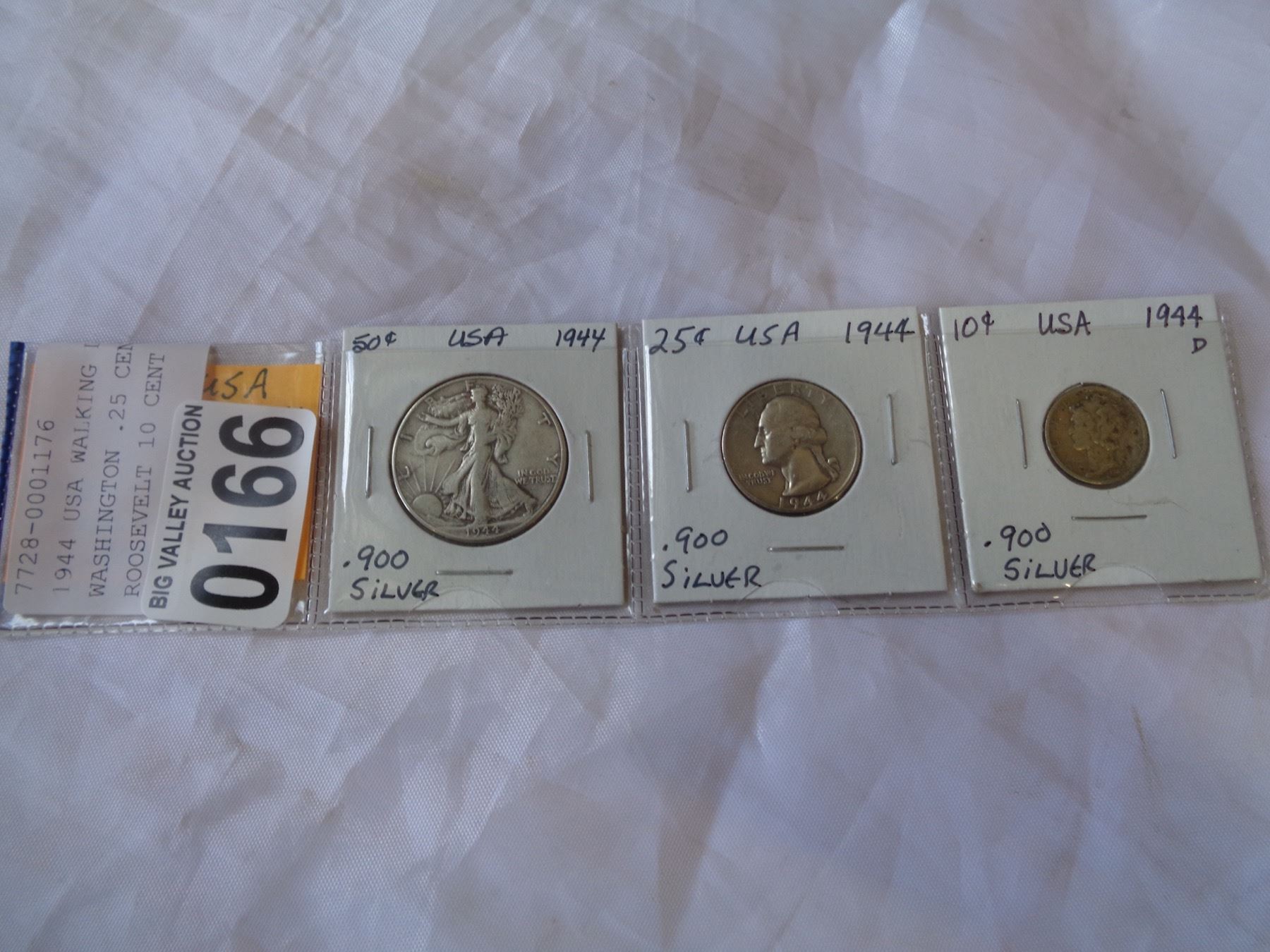 1944 USA WALKING LIBERTY 50 6 WASHINGTON .25 CENT E ROOSEVELT 10 CENT - ALL .900 SILVER