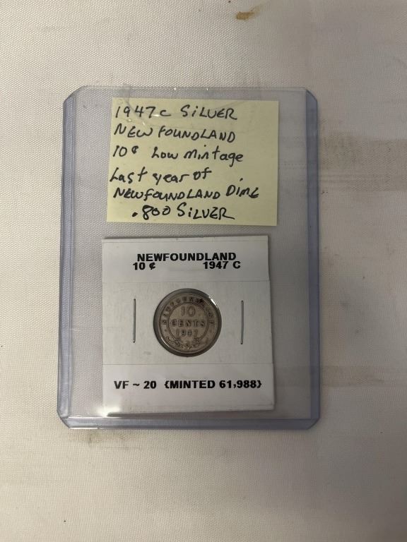 1947 SILVER NEWFOUNDLAND 10 CENT LOW MINTAGE LAST YEAR OF THE NEWFOUNDLAND DIME .800 SILVER