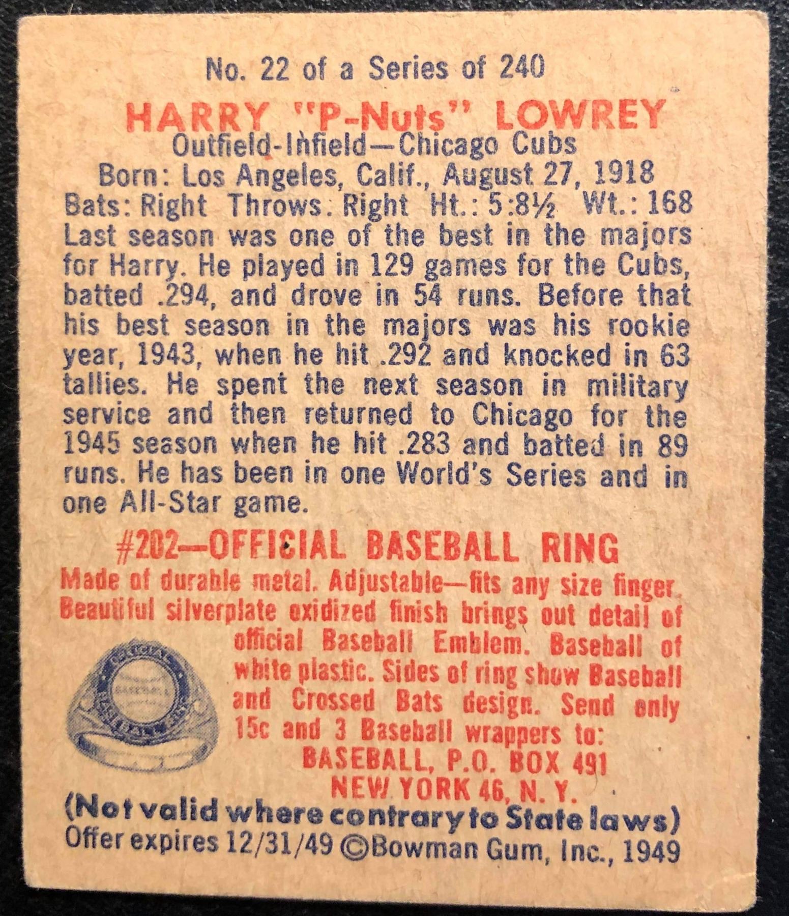 1949 BOWMAN #22 HARRY "P-NUTS" LOWREY CUBS