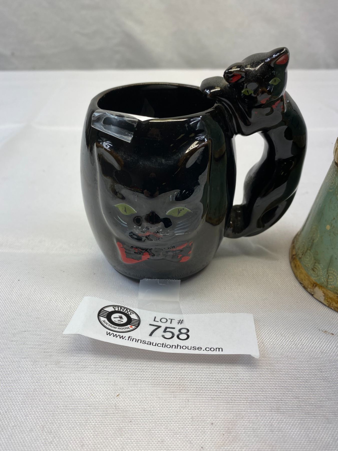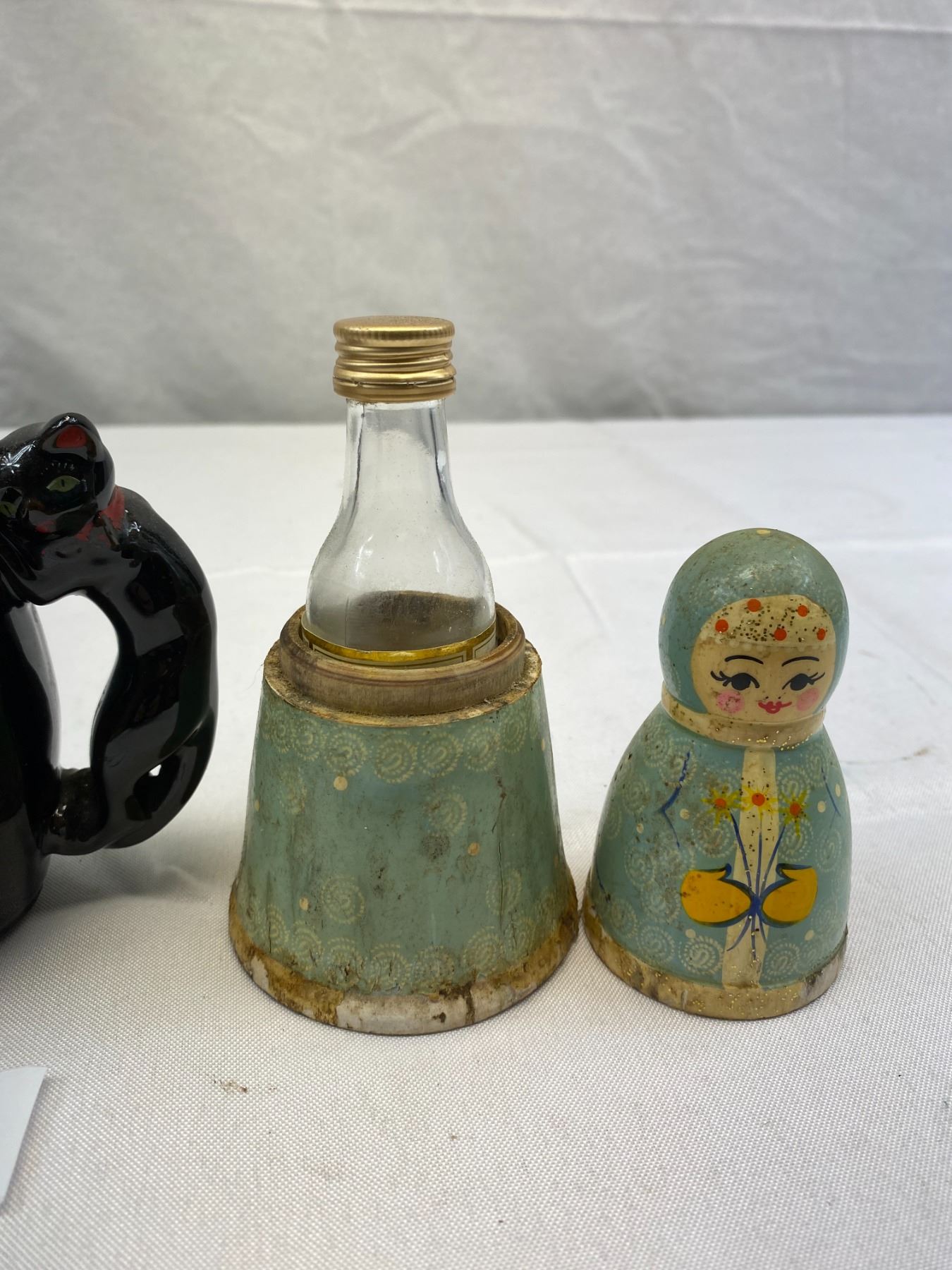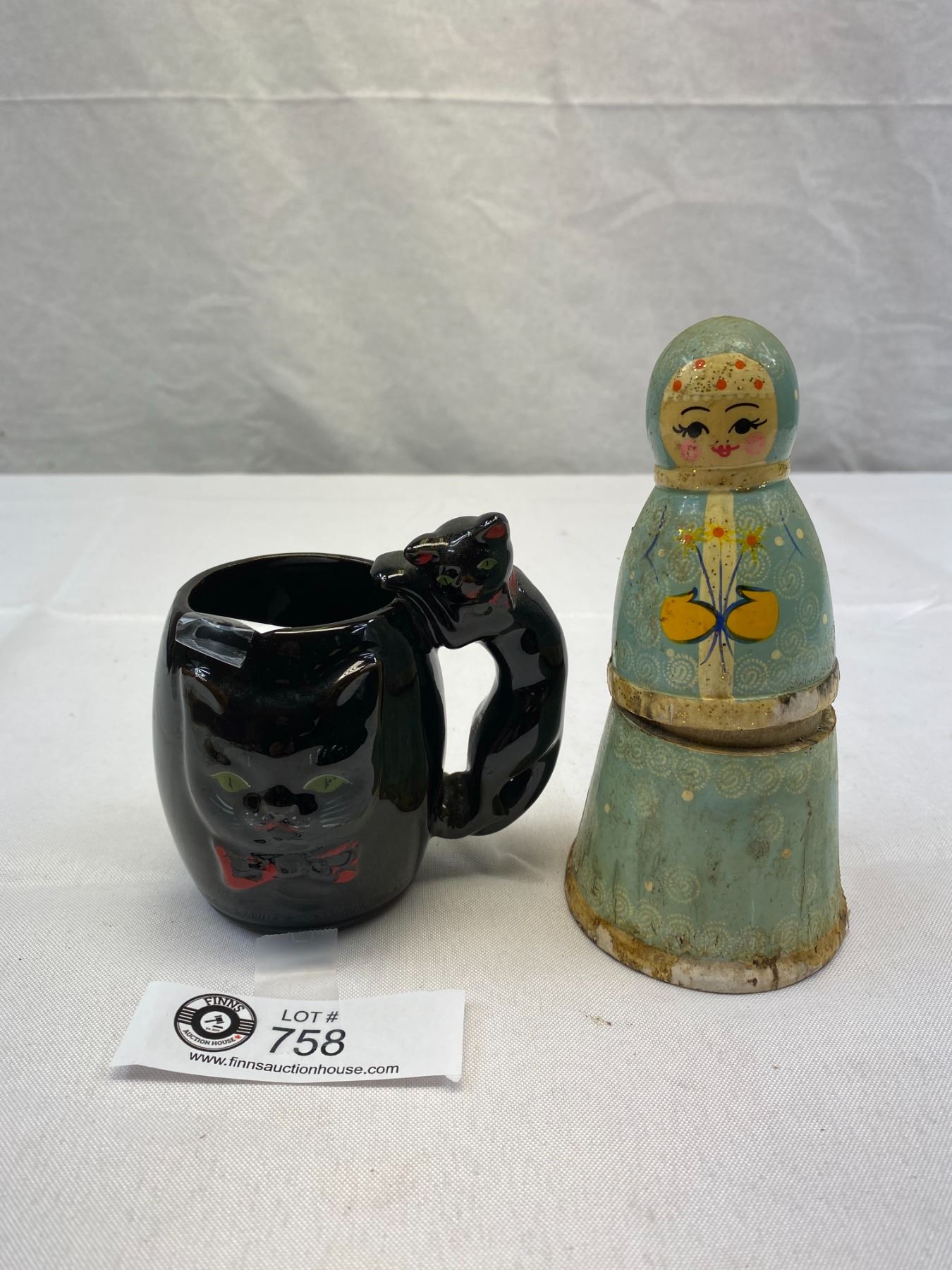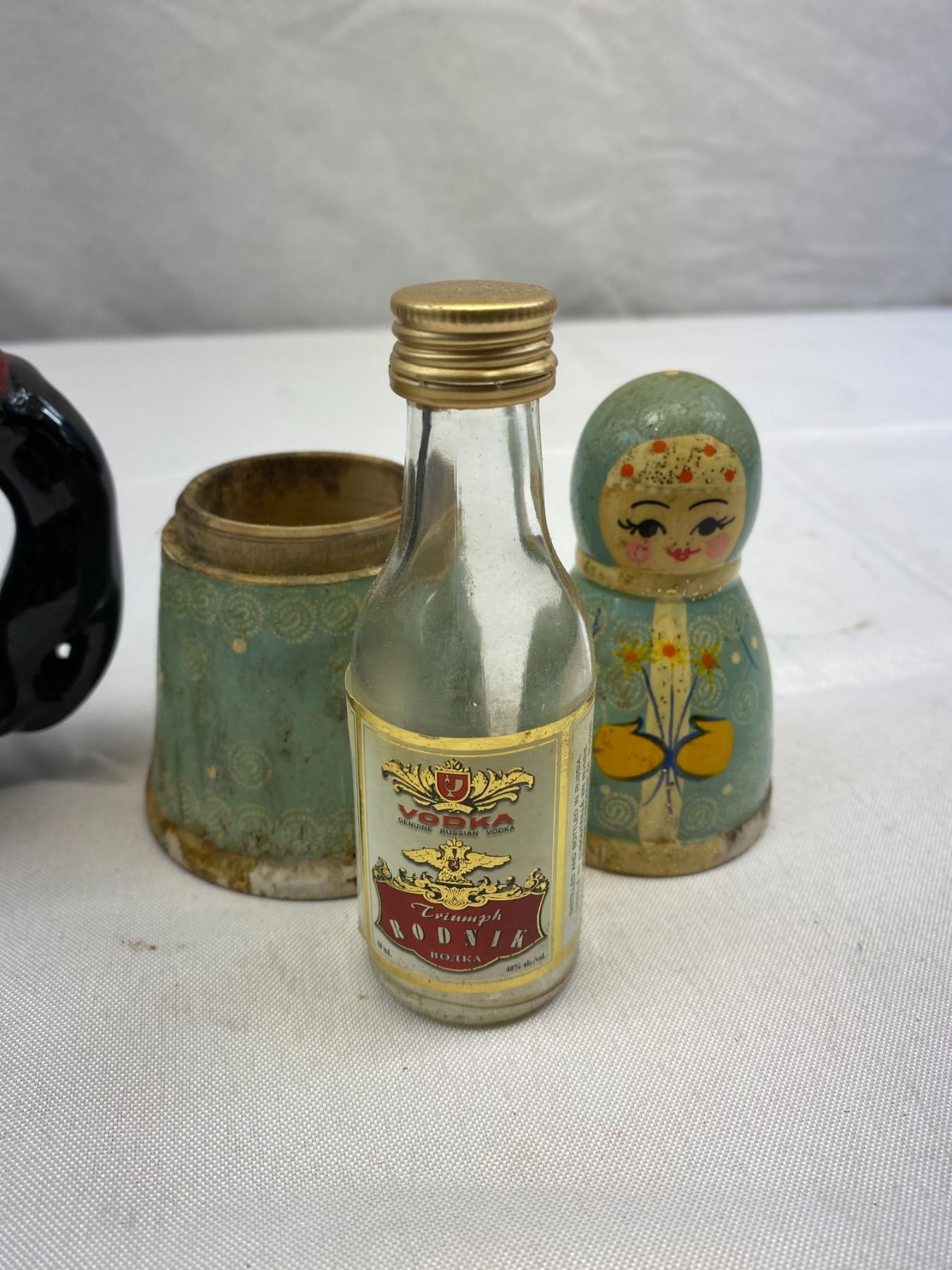 1951 Chafford Black Cat Mug And Hand Made Wood Matryoshka Doll Bottle Holder With Empty Vodka Bottle Inside, Made In Russia