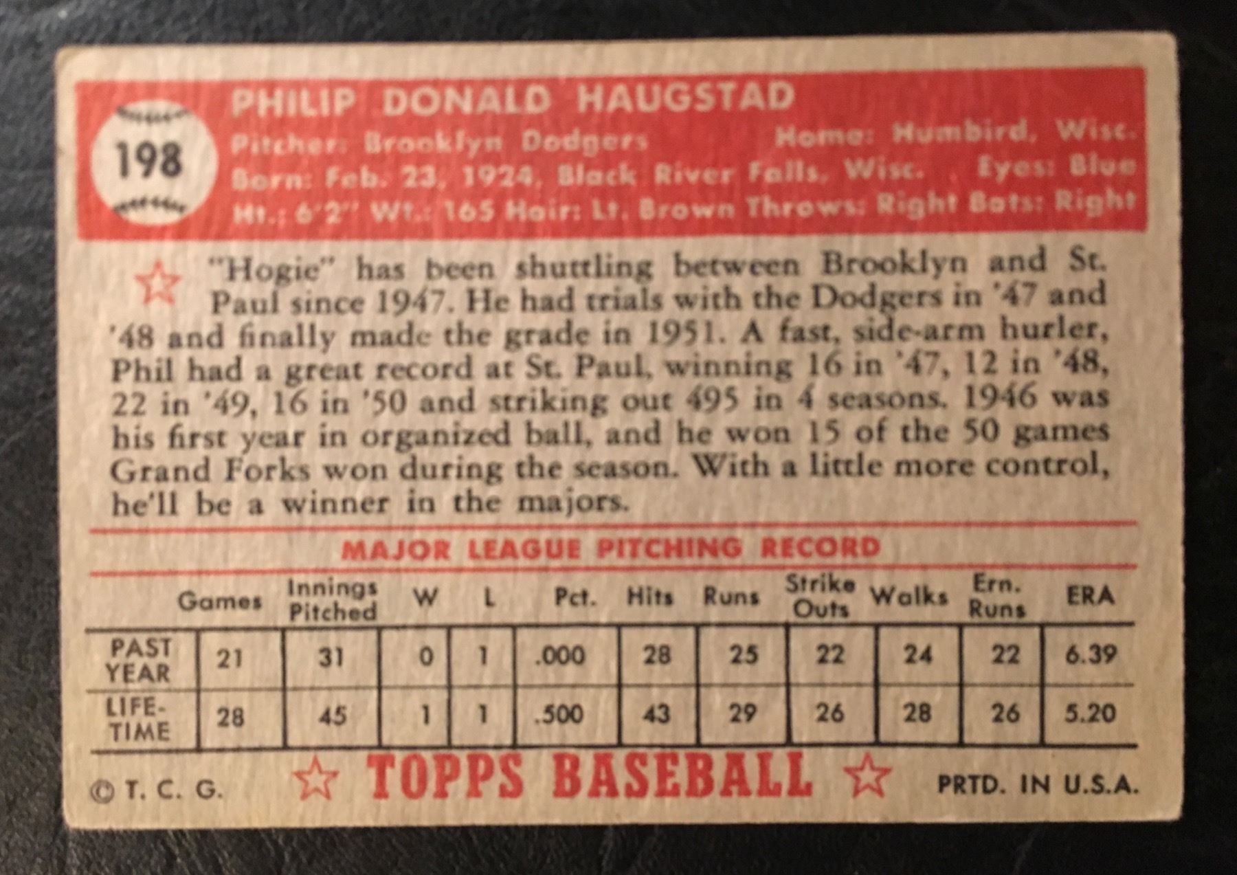1952 Topps #198 Phil Haugstad "ROOKIE"