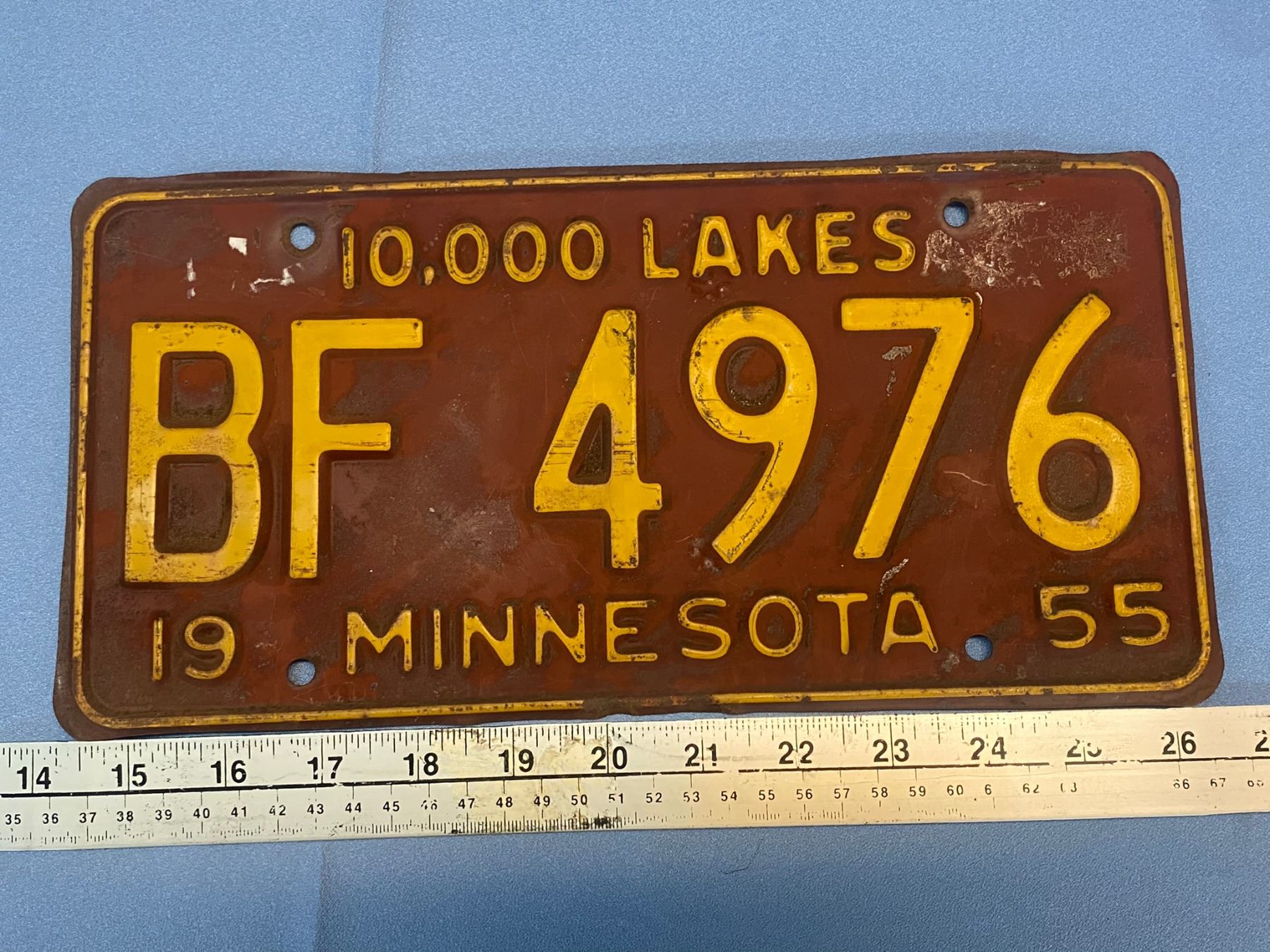1955 MINNESOTA LICENSE PLATE - 17% BUYER FEE. PAYMENT PROCESSED THROUGH LIVE AUCTION WORLD ( VISA OR MASTER CARD ) PICK UP SATURDAY, OR TUESDAY