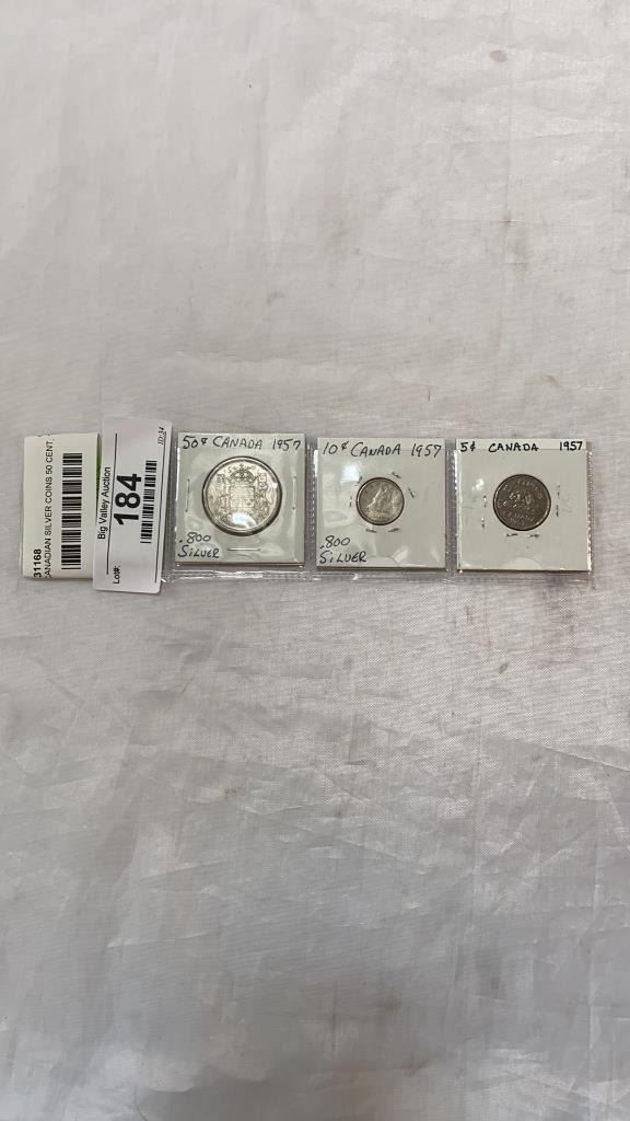 1957 CANADIAN SILVER COINS 50 CENT, 10 CENT, AND 5 CENT - .800 SILVER