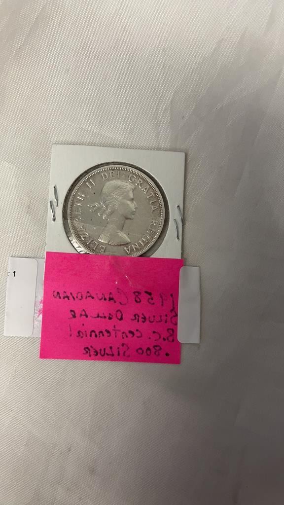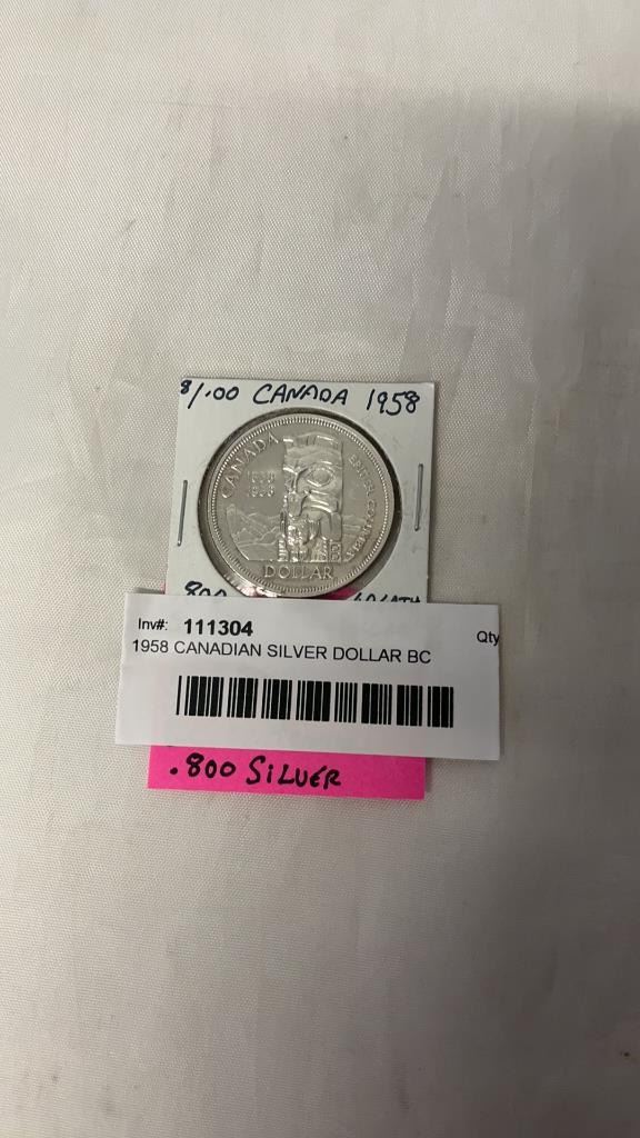 1958 CANADIAN SILVER DOLLAR BC CENTENNIAL .800 SILVER