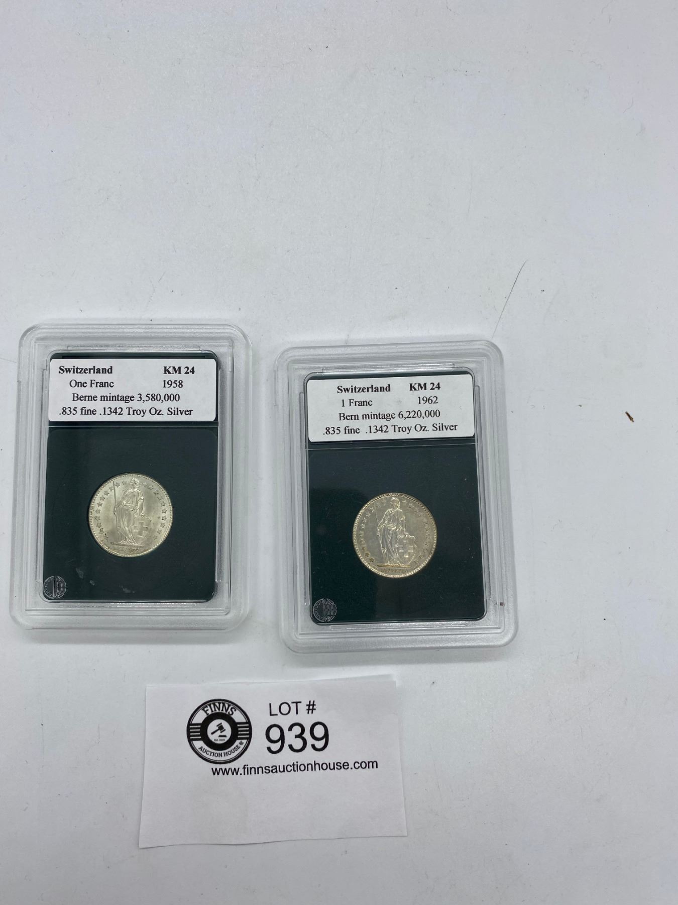 1958 Plus 1962 Swiss 1 Franc Coins in Cases